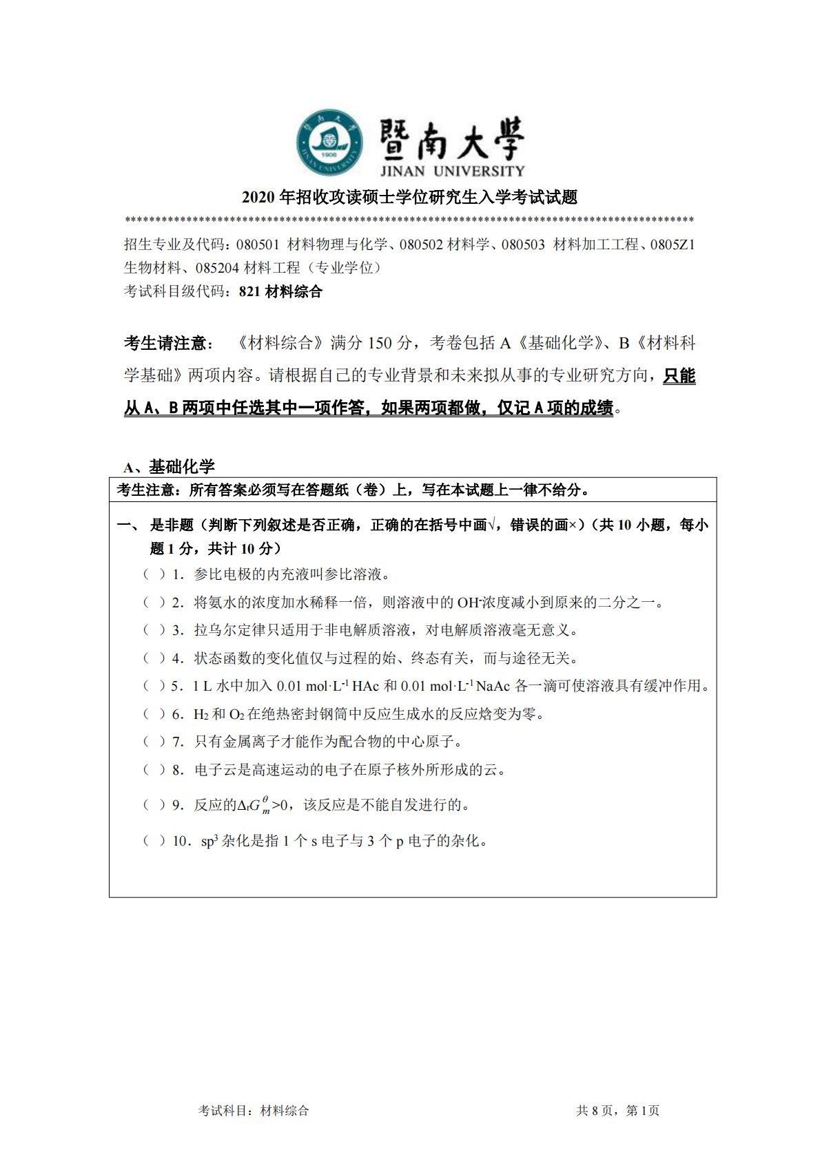暨南大学821材料综合2020年真题