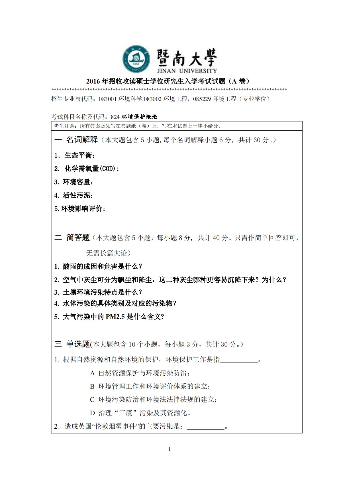 暨南大学824环境保护概论2016年真题