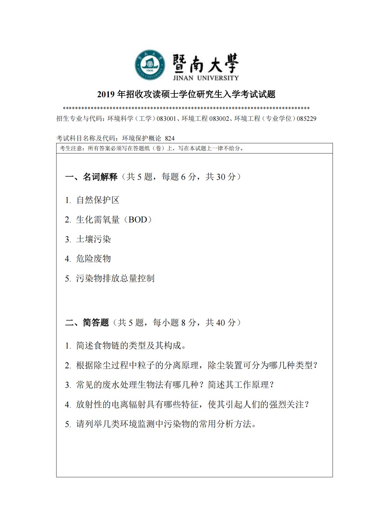 暨南大学824环境保护概论2019年真题