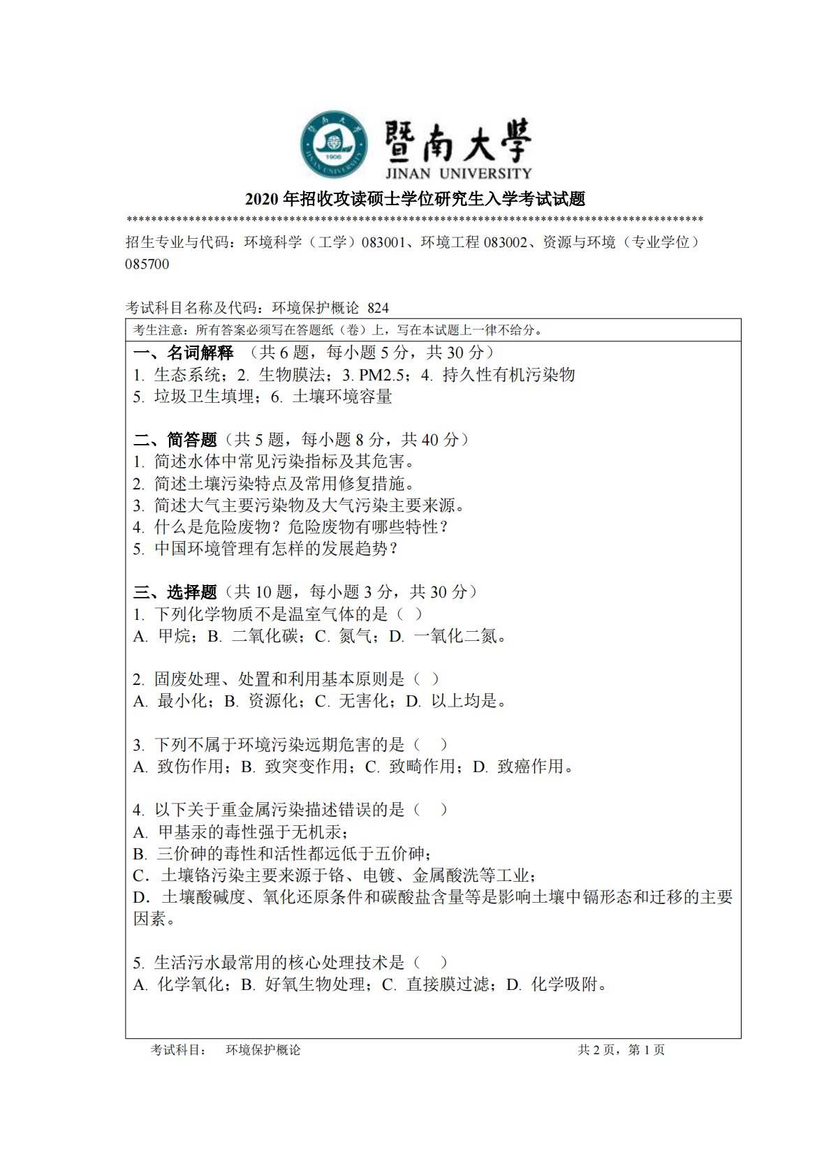 2020年招收攻读硕士学位研究生入学考试试题********************************************************************************************招生专业与代码:环境科学(工学)083001、环境工程083002、资源与环境(专业学位)085700考试科目名称及代码:环境保护概论824考生注意:所有答案必须写在答题纸(卷)上,写在本试题上一律不给分。一、名词解释(共6题,每小题5分,共30分)1.生态系统;2.生物膜法;3.PM2.5;4.持久性有机污染物5.垃圾卫生填埋;6.土壤环境容量二、简答题(共5题,每小...