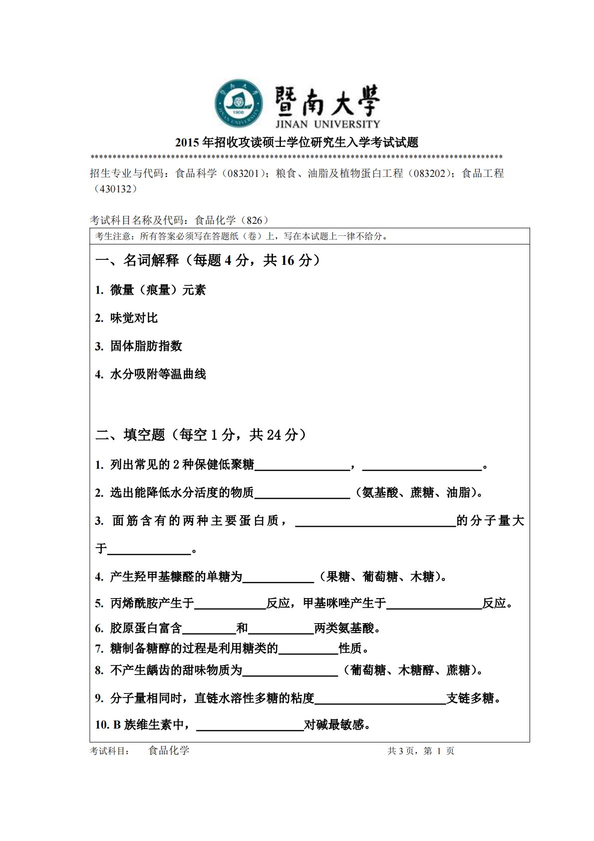2015年招收攻读硕士学位研究生入学考试试题********************************************************************************************招生专业与代码:食品科学(083201);粮食、油脂及植物蛋白工程(083202);食品工程(430132)考试科目名称及代码:食品化学(826)考生注意:所有答案必须写在答题纸(卷)上,写在本试题上一律不给分。一、名词解释(每题4分,共16分)1.微量(痕量)元素2.味觉对比3.固体脂肪指数4.水分吸附等温曲线二、填空题(每空1分,共24分)1.列出常见的2种保健低聚...