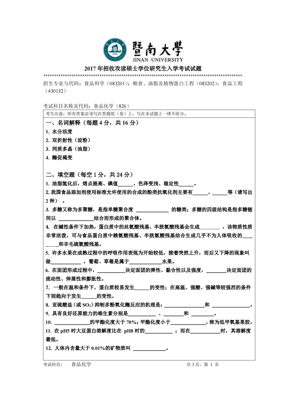 2017年招收攻读硕士学位研究生入学考试试题********************************************************************************************招生专业与代码:食品科学(083201);粮食、油脂及植物蛋白工程(083202);食品工程(430132)考试科目名称及代码:食品化学(826)考生注意:所有答案必须写在答题纸(卷)上,写在本试题上一律不给分。一、名词解释(每题4分,共16分)1.水分活度2.双折射性(淀粉)3.同质多晶(油脂)4.酶促褐变二、填空题(每空1分,共24分)1.油脂氢化后,熔点提高、碘值...