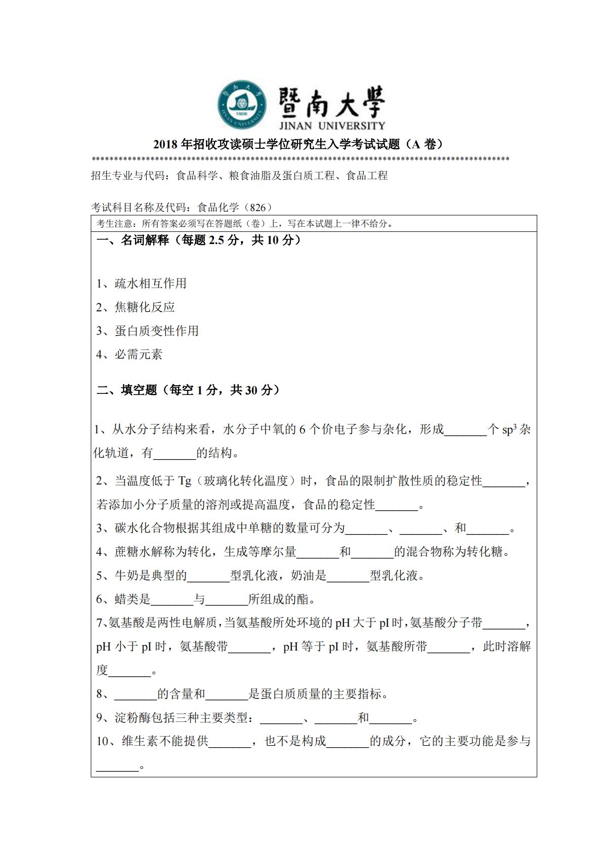 2018年招收攻读硕士学位研究生入学考试试题(A卷)********************************************************************************************招生专业与代码:食品科学、粮食油脂及蛋白质工程、食品工程考试科目名称及代码:食品化学(826)考生注意:所有答案必须写在答题纸(卷)上,写在本试题上一律不给分。一、名词解释(每题2.5分,共10分)1、疏水相互作用2、焦糖化反应3、蛋白质变性作用4、必需元素二、填空题(每空1分,共30分)1、从水分子结构来看,水分子中氧的6个价电子参与杂化,形成_______个...