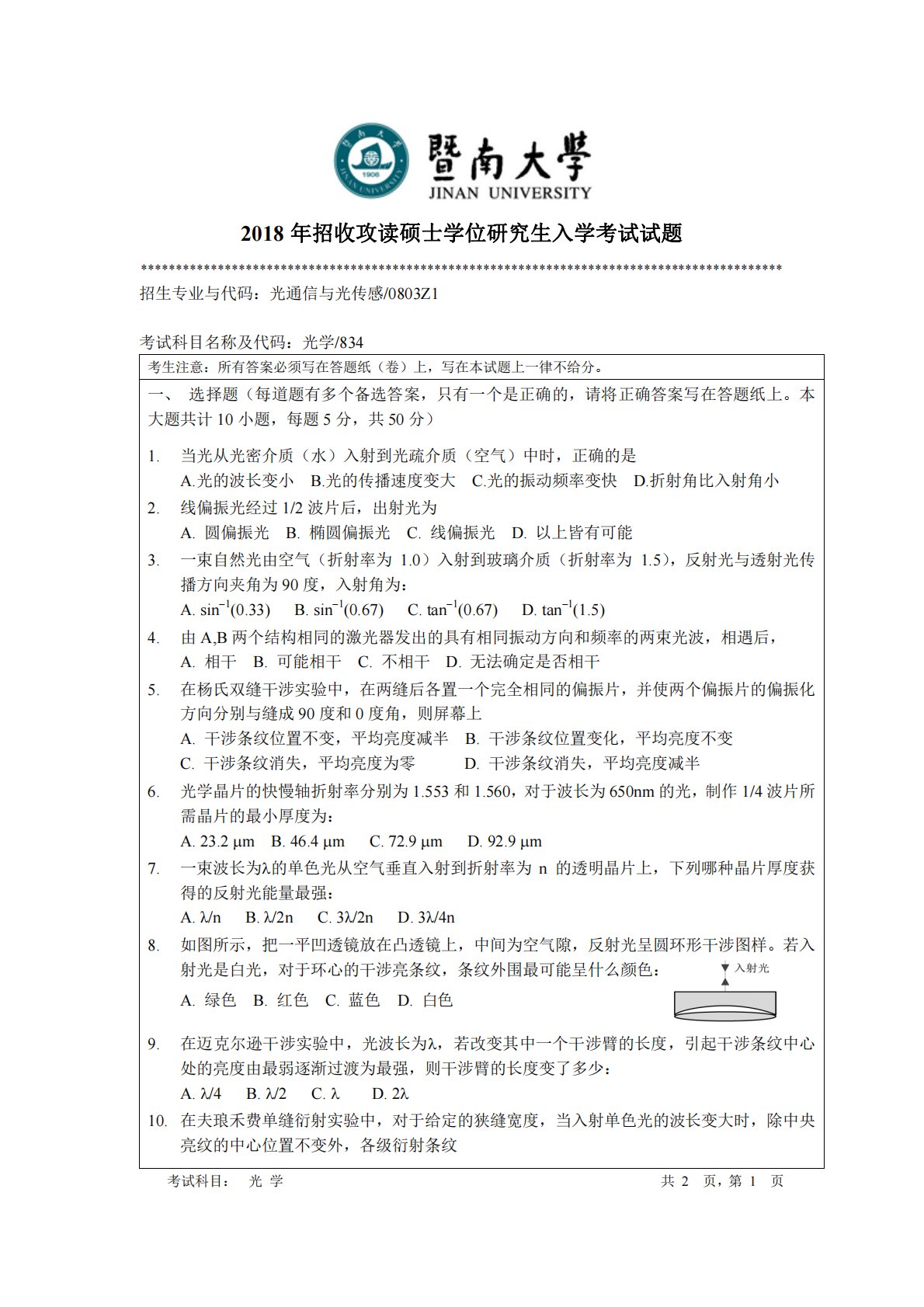 2018年招收攻读硕士学位研究生入学考试试题********************************************************************************************招生专业与代码:光通信与光传感/0803Z1考试科目名称及代码:光学/834考生注意:所有答案必须写在答题纸(卷)上,写在本试题上一律不给分。一、选择题(每道题有多个备选答案,只有一个是正确的,请将正确答案写在答题纸上。本大题共计10小题,每题5分,共50分)1.当光从光密介质(水)入射到光疏介质(空气)中时,正确的是A.光的波长变小B.光的传播速度变大C.光的振动频率...