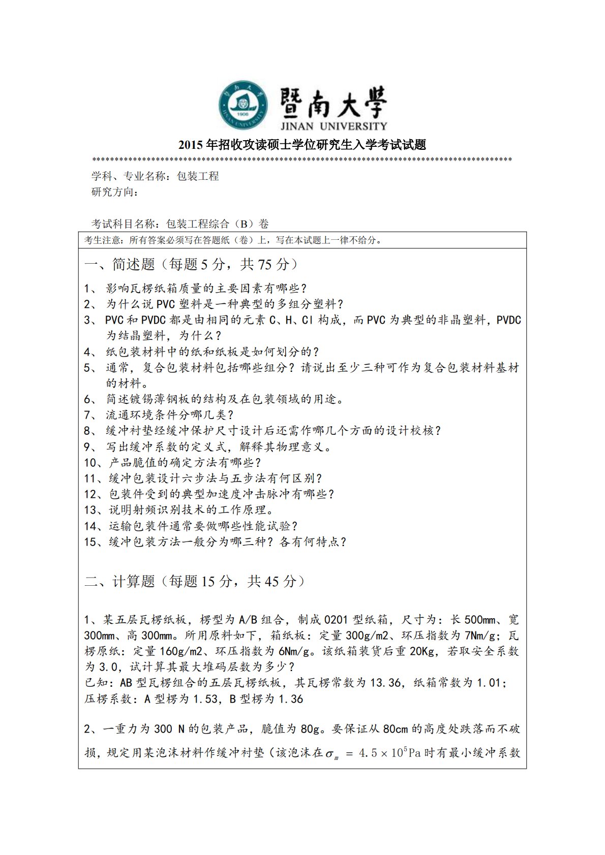 2015年招收攻读硕士学位研究生入学考试试题********************************************************************************************学科、专业名称:包装工程研究方向:考试科目名称:包装工程综合(B)卷考生注意:所有答案必须写在答题纸(卷)上,写在本试题上一律不给分。一、简述题(每题5分,共75分)1、影响瓦楞纸箱质量的主要因素有哪些?2、为什么说PVC塑料是一种典型的多组分塑料?3、PVC和PVDC都是由相同的元素C、H、Cl构成,而PVC为典型的非晶塑料,PVDC为结晶塑料,为什么?4、纸包装材料...