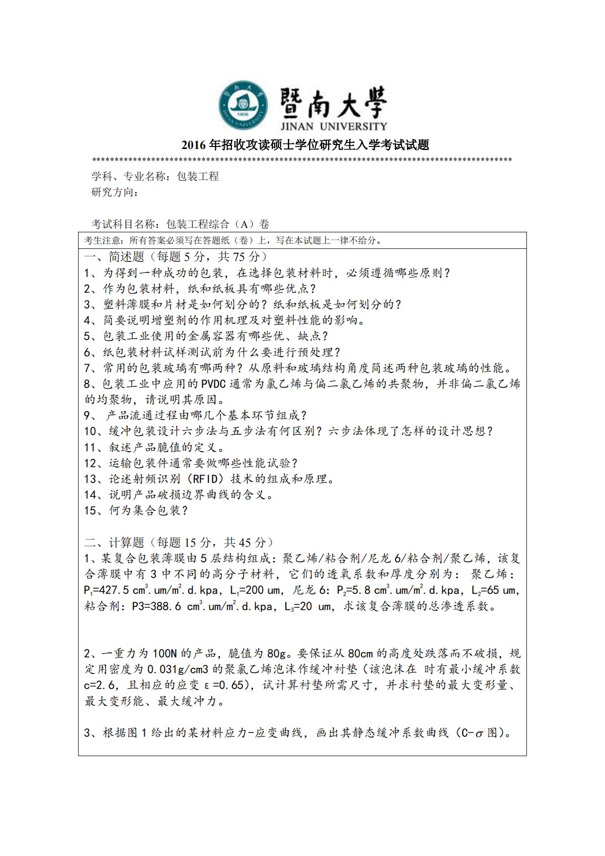 暨南大学835包装工程综合2016年真题