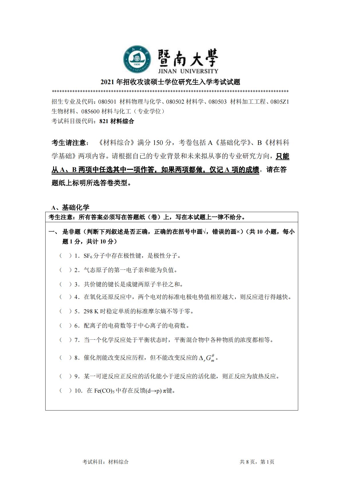 暨南大学821材料综合2021年真题