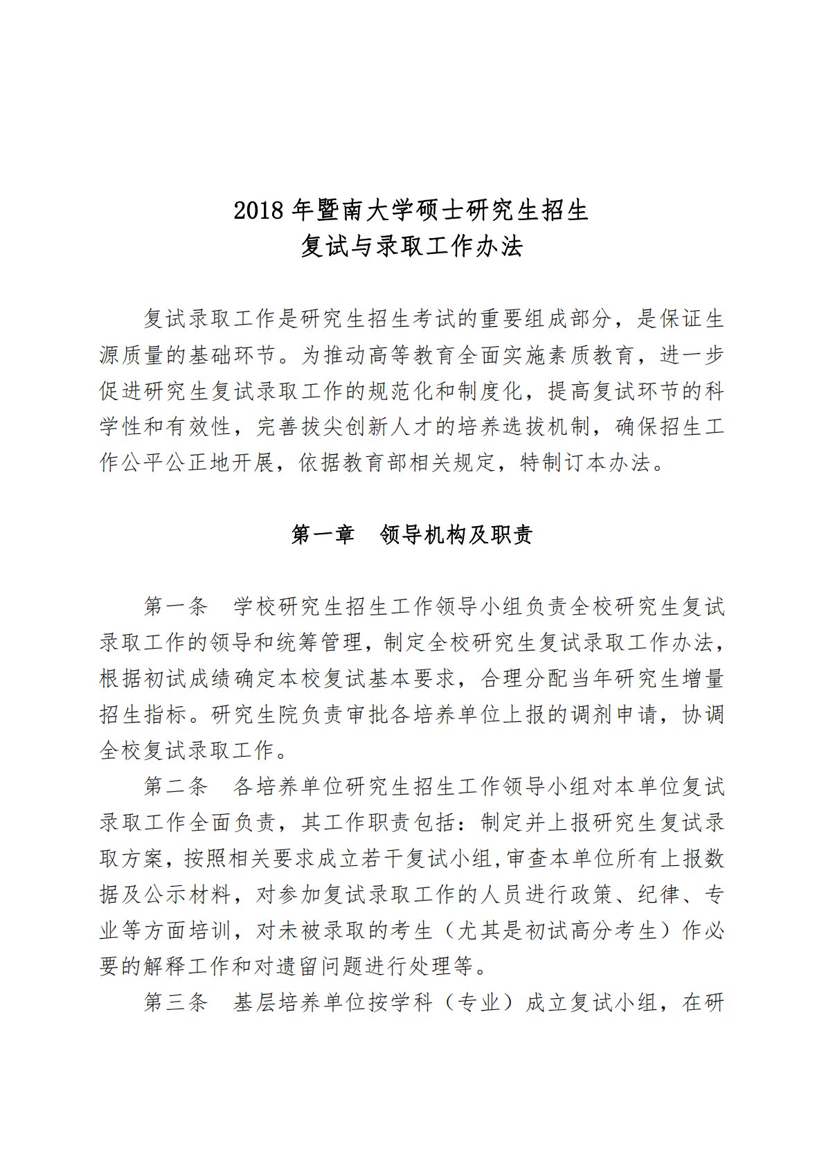 2018年暨南大学硕士研究生招生复试与录取工作办法复试录取工作是研究生招生考试的重要组成部分,是保证生源质量的基础环节。为推动高等教育全面实施素质教育,进一步促进研究生复试录取工作的规范化和制度化,提高复试环节的科学性和有效性,完善拔尖创新人才的培养选拔机制,确保招生工作公平公正地开展,依据教育部相关规定,特制订本办法。第一章领导机构及职责第一条学校研究生招生工作领导小组负责全校研究生复试录取工作的领导和统筹管理,制定全校研究生复试录取工作办法,根据初试成绩确定本校复试基本要求,合理分配当年研究生增量招生指标。研究生院负责审批各培养单位上报的调剂申请,协调全校复试录取工作。第二条各培养单位研究...