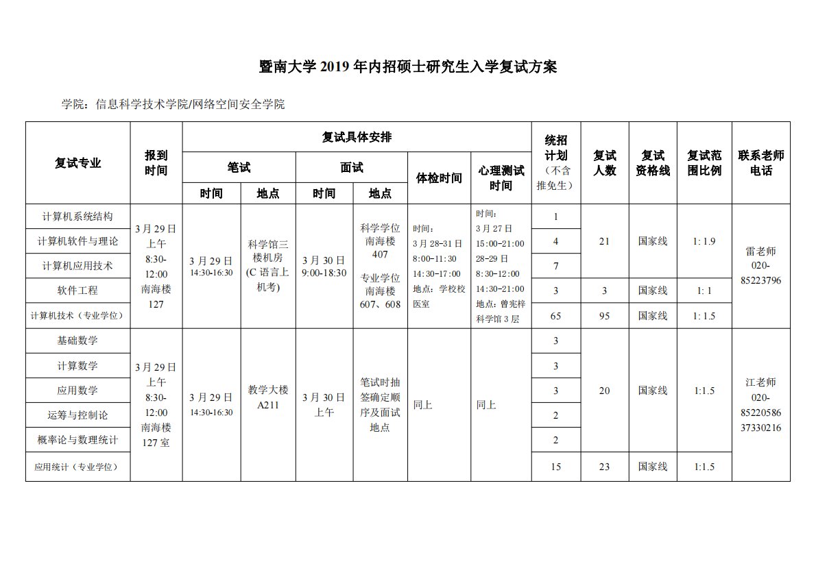 暨南大学2019年内招硕士研究生入学复试方案学院:信息科学技术学院/网络空间安全学院复试专业报到时间复试具体安排统招计划(不含推免生)复试人数复试资格线复试范围比例联系老师电话笔试面试体检时间心理测试时间时间地点时间地点计算机系统结构3月29日上午8:30-12:00南海楼1273月29日14:30-16:30科学馆三楼机房(C语言上机考)3月30日9:00-18:30科学学位南海楼407专业学位南海楼607、608时间:3月28-31日8:00-11:3014:30-17:00地点:学校校医室时间:3月27日15:00-21:0028-29日8:30-12:0014:30-21:00地点:曾...