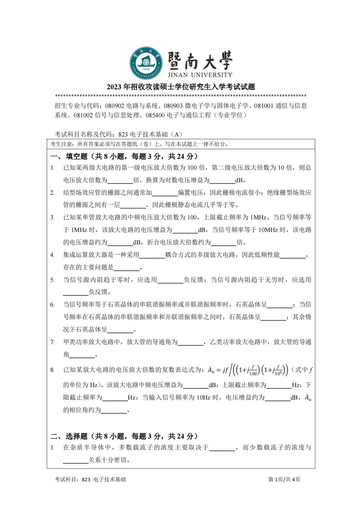 考试科目:823电子技术基础第1页/共4页2023年招收攻读硕士学位研究生入学考试试题********************************************************************************************招生专业与代码:080902电路与系统、080903微电子学与固体电子学、081001通信与信息系统、081002信号与信息处理、085400电子与通信工程(专业学位)考试科目名称及代码:823电子技术基础(A)考生注意:所有答案必须写在答题纸(卷)上,写在本试题上一律不给分。一、填空题(共8小题,每题3分,共24分)1.已知某...