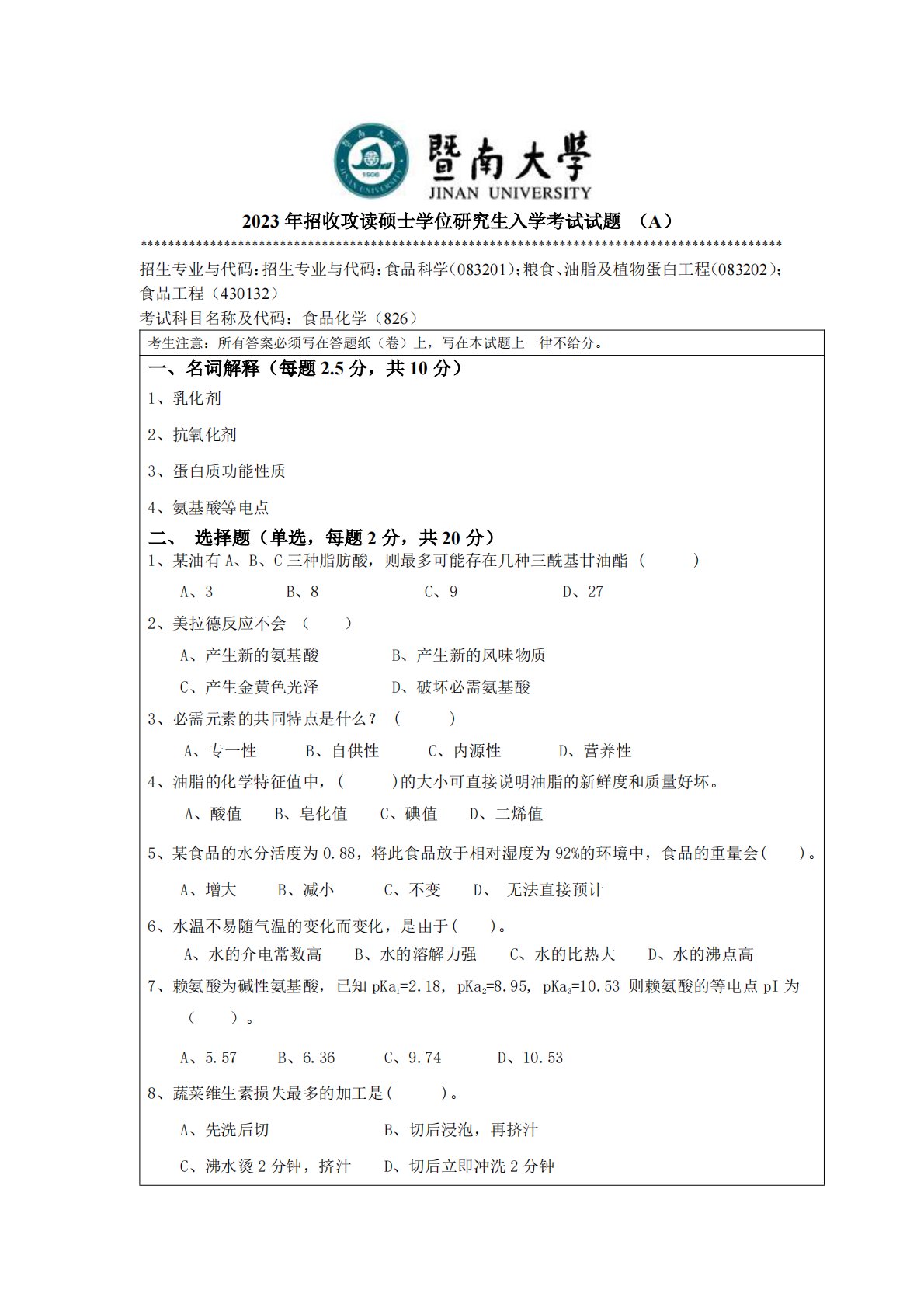 暨南大学826食品化学2023年真题