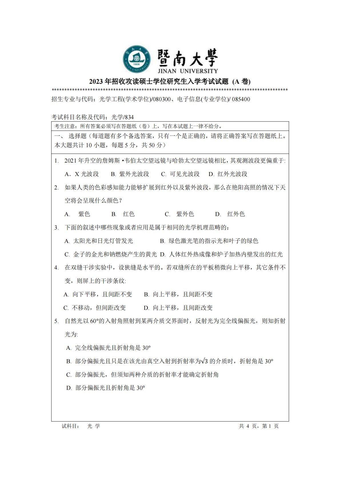 2023年招收攻读硕士学位研究生入学考试试题(A卷)********************************************************************************************招生专业与代码:光学工程(学术学位)/080300、电子信息(专业学位)/085400考试科目名称及代码:光学/834考生注意:所有答案必须写在答题纸(卷)上,写在本试题上一律不给分。一、选择题(每道题有多个备选答案,只有一个是正确的,请将正确答案写在答题纸上。本大题共计10小题,每题5分,共50分)1.2021年升空的詹姆斯·韦伯太空望远镜与哈勃太空望远镜相比...