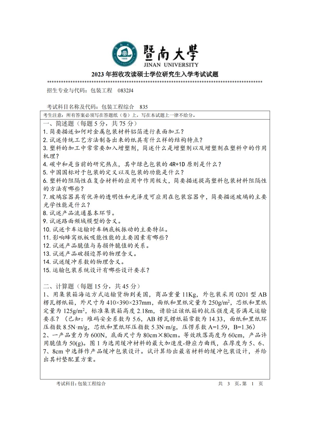 暨南大学835包装工程综合2023年真题