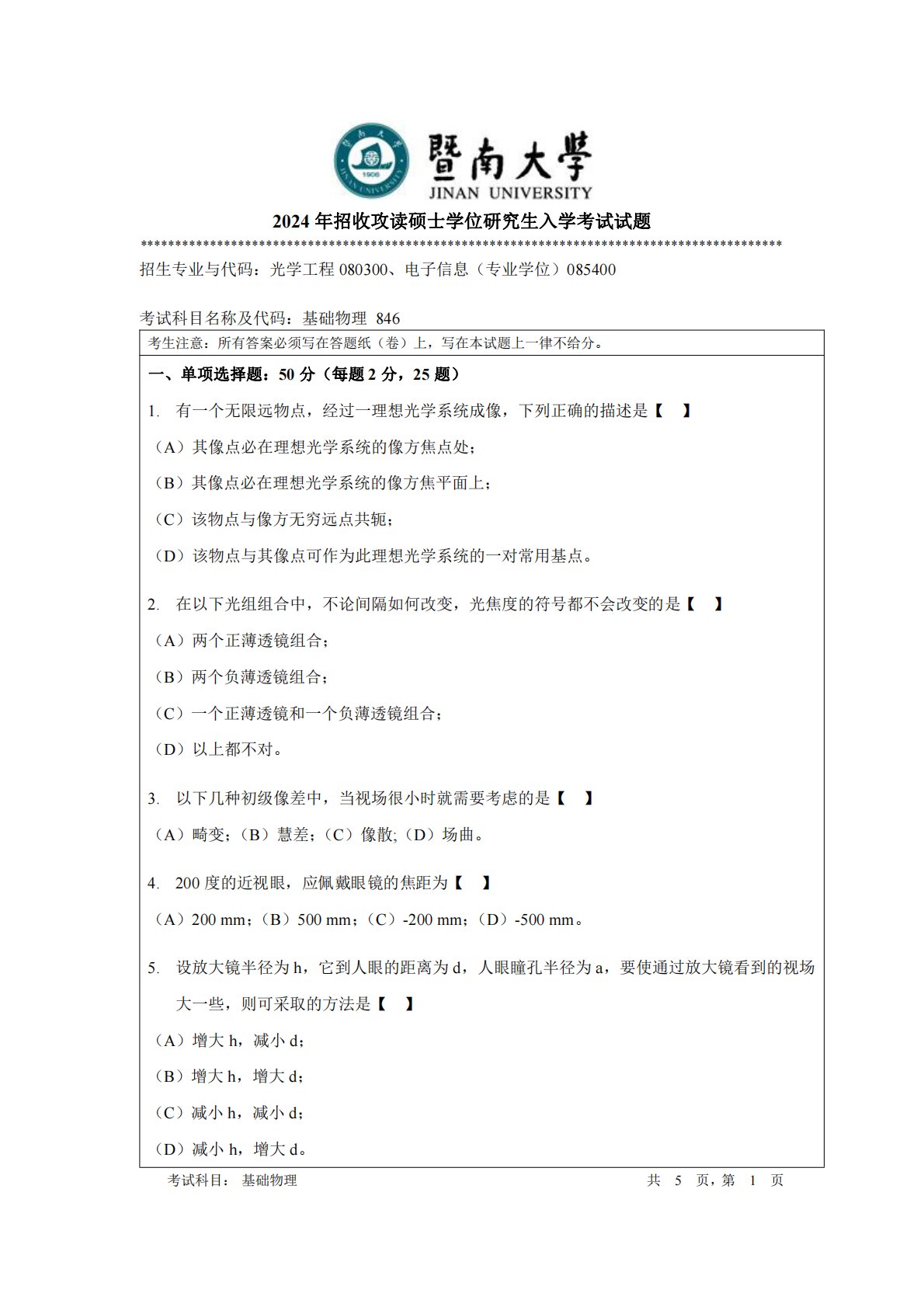 2024年招收攻读硕士学位研究生入学考试试题********************************************************************************************招生专业与代码:光学工程080300、电子信息(专业学位)085400考试科目名称及代码:基础物理846考生注意:所有答案必须写在答题纸(卷)上,写在本试题上一律不给分。一、单项选择题:50分(每题2分,25题)1.有一个无限远物点,经过一理想光学系统成像,下列正确的描述是【】(A)其像点必在理想光学系统的像方焦点处;(B)其像点必在理想光学系统的像方焦平面上;(C)该...