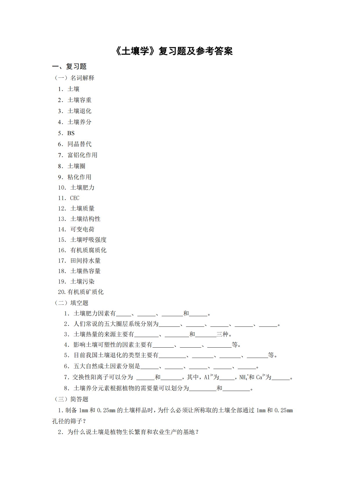 《土壤学》复习题及参考答案一、复习题(一)名词解释1.土壤2.土壤容重3.土壤退化4.土壤养分5.BS6.同晶替代7.富铝化作用8.土壤圈9.粘化作用10.土壤肥力11.CEC12.土壤质量13.土壤结构性14.可变电荷15.土壤呼吸强度16.有机质腐质化17.田间持水量18.土壤热容量19.土壤污染20.有机质矿质化(二)填空题1.土壤肥力因素有、、和。2.人们常说的五大圈层系统分别为、、、、。3.土壤热量的来源主要有、和三种。4.影响土壤可塑性的因素主要有、、等。5.目前我国土壤退化的类型主要有、、、等。6.五大自然成土因素分别是、、、、。7.交换性阳离子可以分为和,其中,Al3+为,NH...