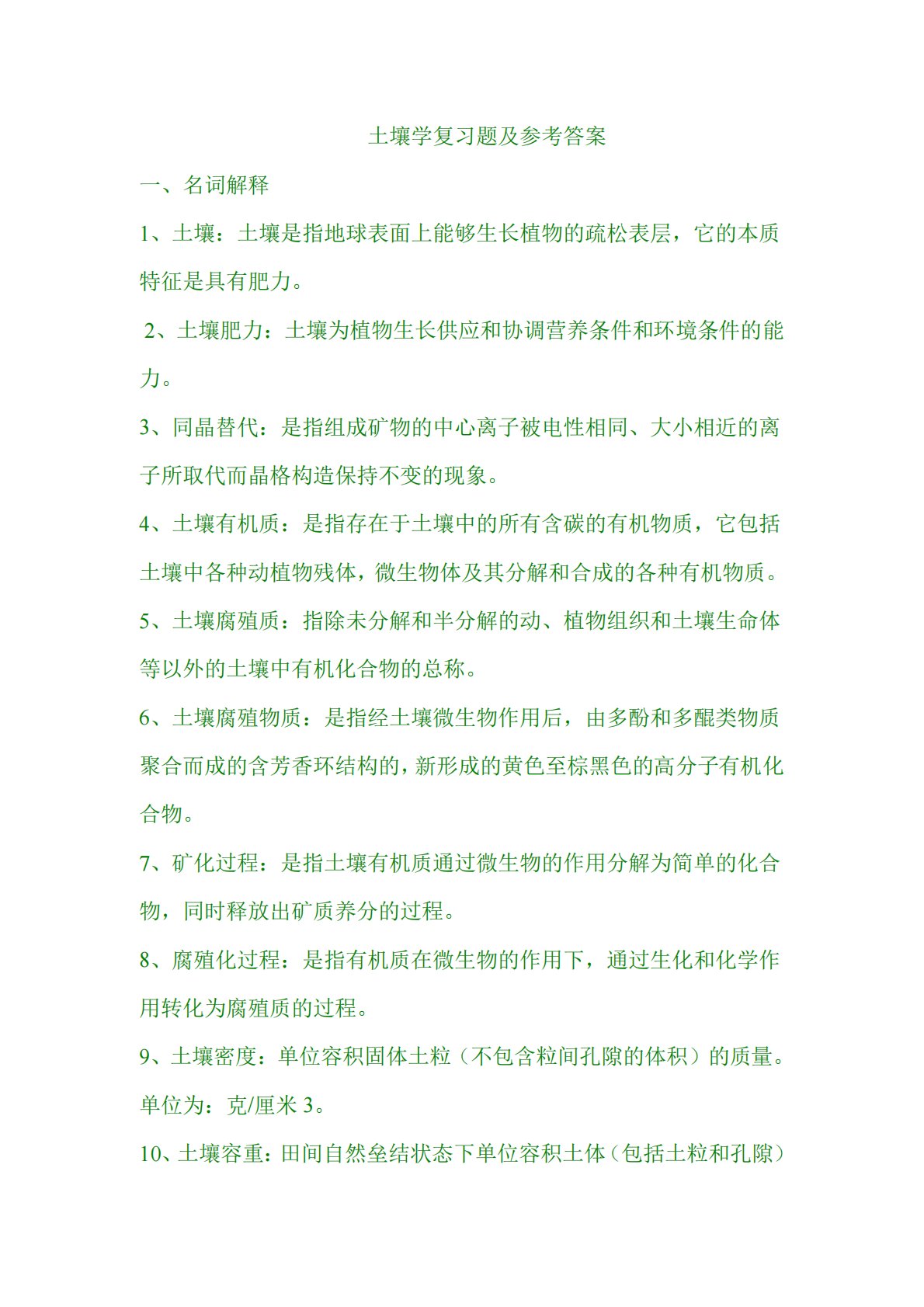 土壤学复习题及参考答案一、名词解释1、土壤:土壤是指地球表面上能够生长植物的疏松表层,它的本质特征是具有肥力。2、土壤肥力:土壤为植物生长供应和协调营养条件和环境条件的能力。3、同晶替代:是指组成矿物的中心离子被电性相同、大小相近的离子所取代而晶格构造保持不变的现象。4、土壤有机质:是指存在于土壤中的所有含碳的有机物质,它包括土壤中各种动植物残体,微生物体及其分解和合成的各种有机物质。5、土壤腐殖质:指除未分解和半分解的动、植物组织和土壤生命体等以外的土壤中有机化合物的总称。6、土壤腐殖物质:是指经土壤微生物作用后,由多酚和多醌类物质聚合而成的含芳香环结构的,新形成的黄色至棕黑色的高分子有机化...
