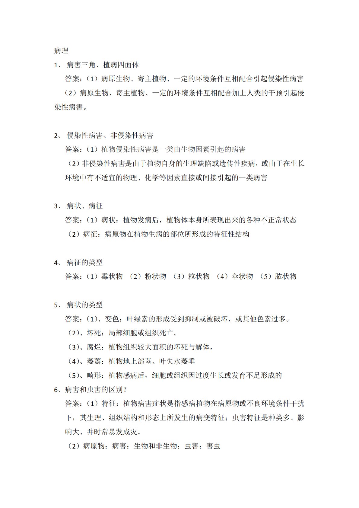 病理1、病害三角、植病四面体答案:(1)病原生物、寄主植物、一定的环境条件互相配合引起侵染性病害(2)病原生物、寄主植物、一定的环境条件互相配合加上人类的干预引起侵染性病害。2、侵染性病害、非侵染性病害答案:(1)植物侵染性病害是一类由生物因素引起的病害(2)非侵染性病害是由于植物自身的生理缺陷或遗传性疾病,或由于在生长环境中有不适宜的物理、化学等因素直接或间接引起的一类病害3、病状、病征答案:(1)病状:植物发病后,植物体本身所表现出来的各种不正常状态(2)病征:病原物在植物生病的部位所形成的特征性结构4、病征的类型答案:(1)霉状物(2)粉状物(3)粒状物(4)伞状物(5)脓状物5、病状的...