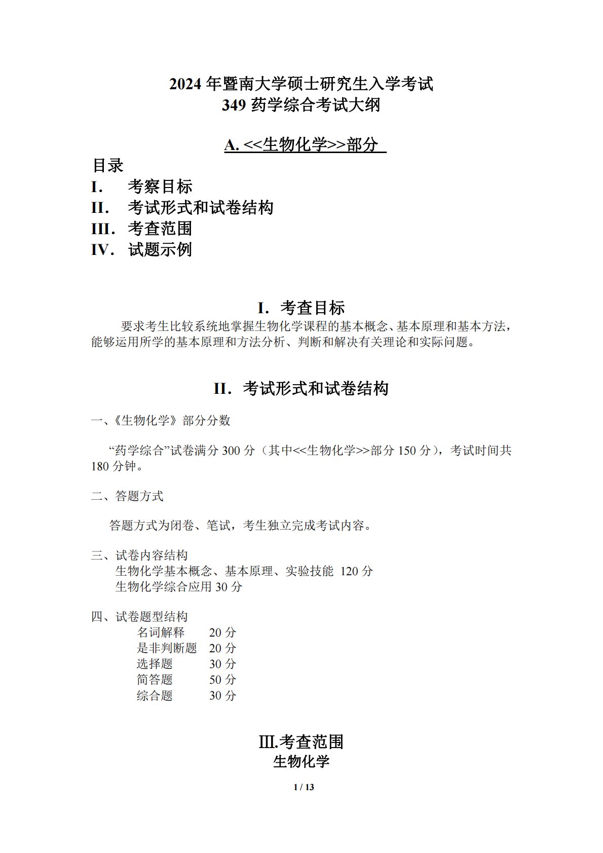 1/132024年暨南大学硕士研究生入学考试349药学综合考试大纲A.>部分目录I.考察目标II.考试形式和试卷结构III.考查范围IV.试题示例I.考查目标要求考生比较系统地掌握生物化学课程的基本概念、基本原理和基本方法,能够运用所学的基本原理和方法分析、判断和解决有关理论和实际问题。II.考试形式和试卷结构一、《生物化学》部分分数“药学综合”试卷满分300分(其中>部分150分),考试时间共180分钟。二、答题方式答题方式为闭卷、笔试,考生独立完成考试内容。三、试卷内容结构生物化学基本概念、基本原理、实验技能120分生物化学综合应用30分四、试卷题型结构名词解释20分是非判断题20分选择题...