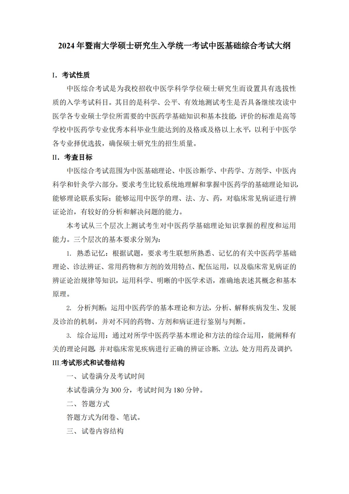 2024年暨南大学硕士研究生入学统一考试中医基础综合考试大纲I.考试性质中医综合考试是为我校招收中医学科学学位硕士研究生而设置具有选拔性质的入学考试科目。其目的是科学、公平、有效地测试考生是否具备继续攻读中医学各专业硕士学位所需要的中医药学基础知识和基本技能,评价的标准是高等学校中医药学专业优秀本科毕业生能达到的及格或及格以上水平,以利于中医学各专业择优选拔,确保硕士研究生的招生质量。II.考査目标中医综合考试范围为中医基础理论、中医诊断学、中药学、方剂学、中医内科学和针灸学六部分。要求考生比较系统地理解和掌握中医药学的基础理论知识,能够理论联系实际;能够运用中医学的理、法、方、药,对临床常见...