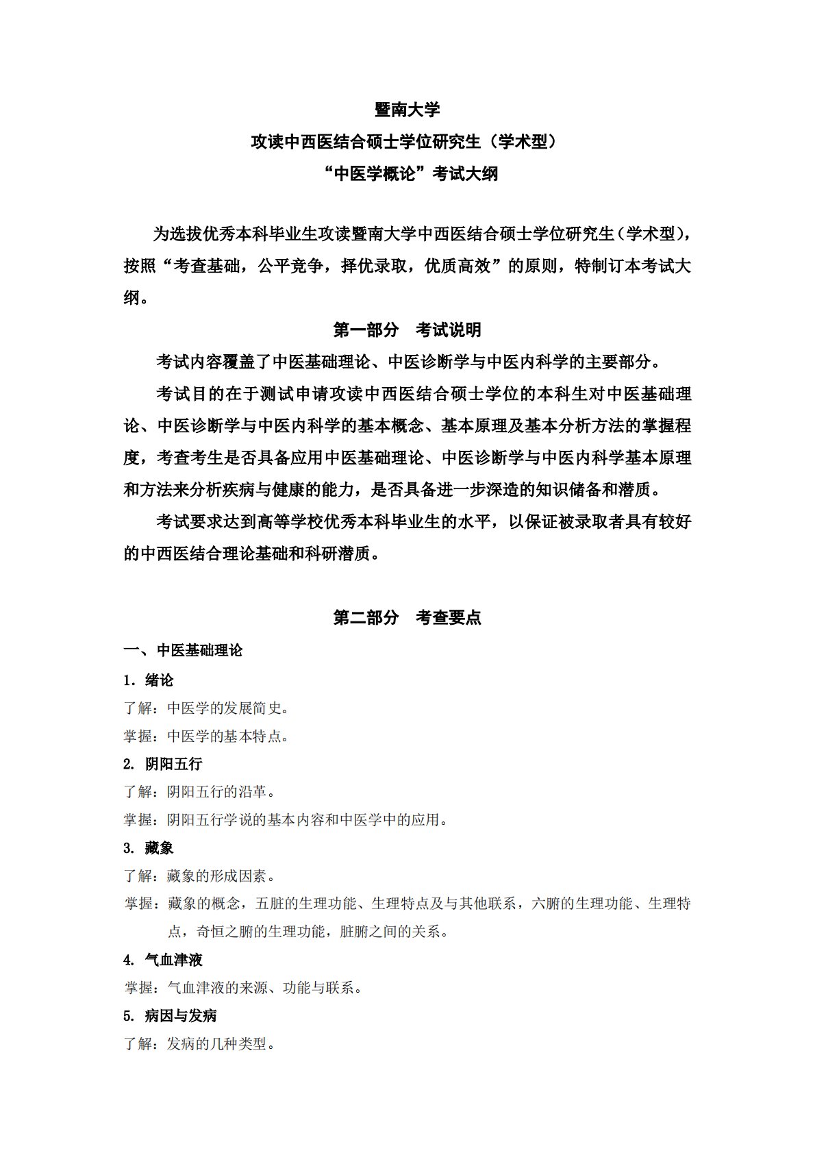 暨南大学攻读中西医结合硕士学位研究生(学术型)“中医学概论”考试大纲为选拔优秀本科毕业生攻读暨南大学中西医结合硕士学位研究生(学术型),按照“考查基础,公平竞争,择优录取,优质高效”的原则,特制订本考试大纲。第一部分考试说明考试内容覆盖了中医基础理论、中医诊断学与中医内科学的主要部分。考试目的在于测试申请攻读中西医结合硕士学位的本科生对中医基础理论、中医诊断学与中医内科学的基本概念、基本原理及基本分析方法的掌握程度,考查考生是否具备应用中医基础理论、中医诊断学与中医内科学基本原理和方法来分析疾病与健康的能力,是否具备进一步深造的知识储备和潜质。考试要求达到高等学校优秀本科毕业生的水平,以保证被...