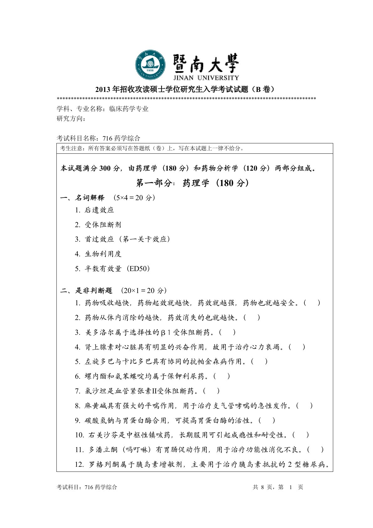 暨南大学716 临床医学综合2013年真题