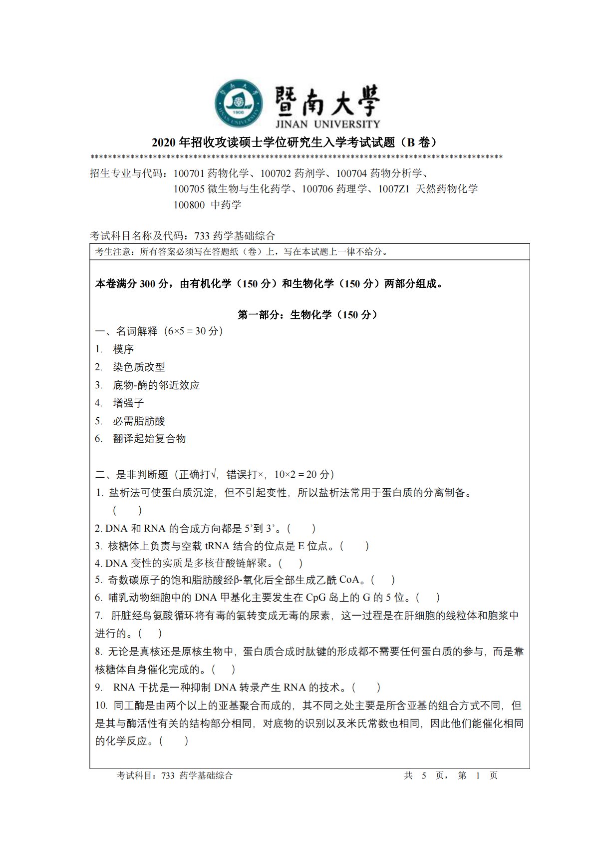 暨南大学733药学基础综合2020年真题