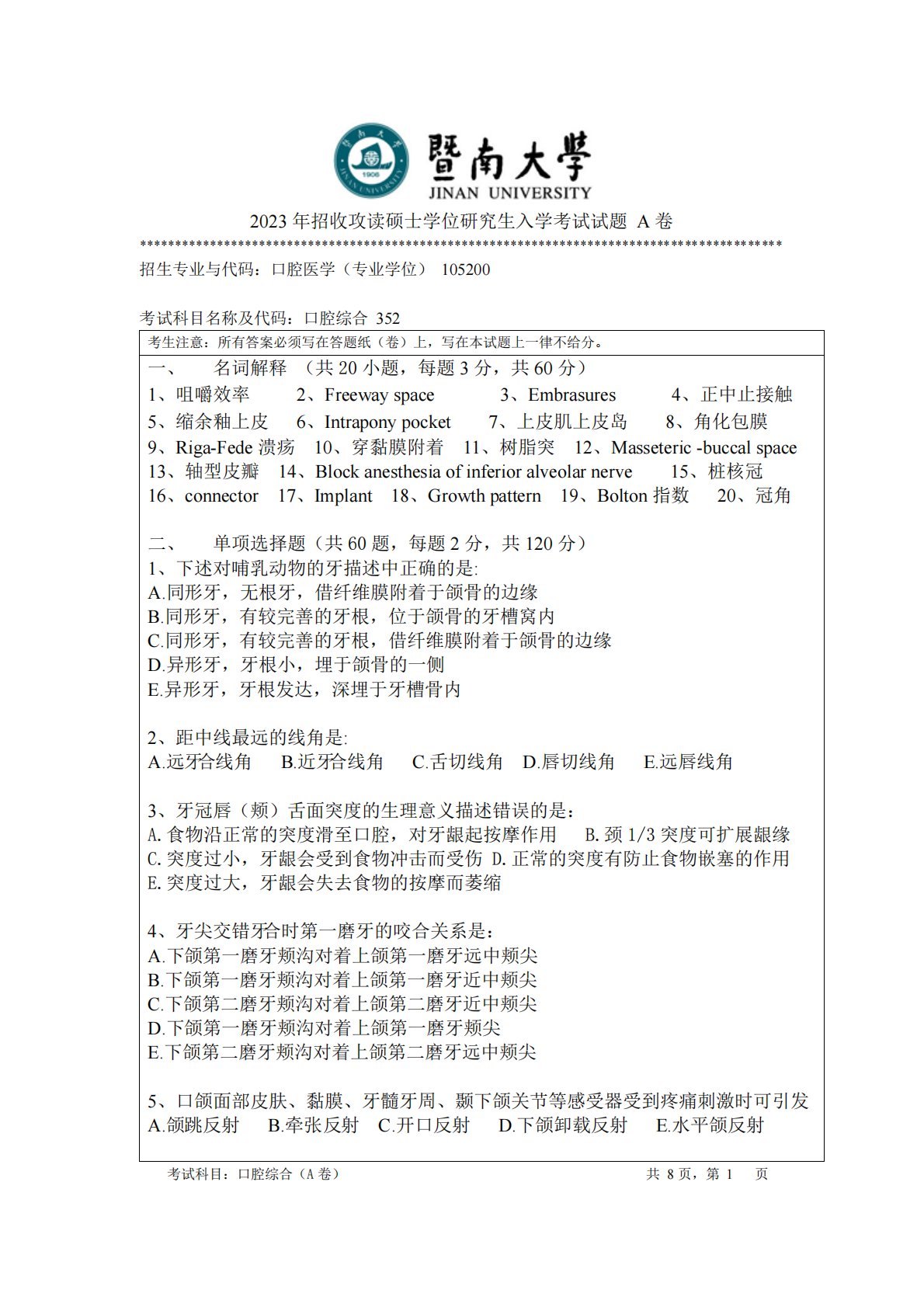 暨南大学352口腔综合2023年真题