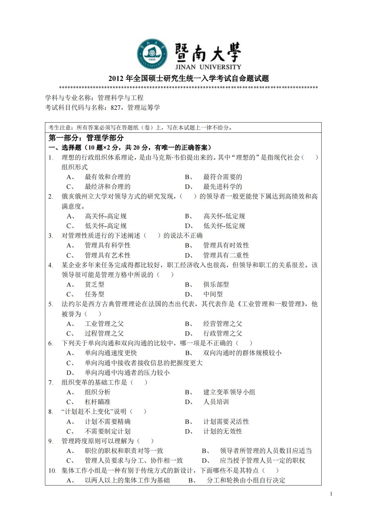 12012年全国硕士研究生统一入学考试自命题试题********************************************************************************************学科与专业名称:管理科学与工程考试科目代码与名称:827,管理运筹学考生注意:所有答案必须写在答题纸(卷)上,写在本试题上一律不给分。第一部分:管理学部分一、选择题(10题×2分,共20分,有唯一的正确答案)1.理想的行政组织体系理论,是由马克斯∙韦伯提出来的。其中“理想的”是指现代社会()组织形式A、最有效和合理的B、最符合需要的C、最经济和合理的D、最先进科学的...