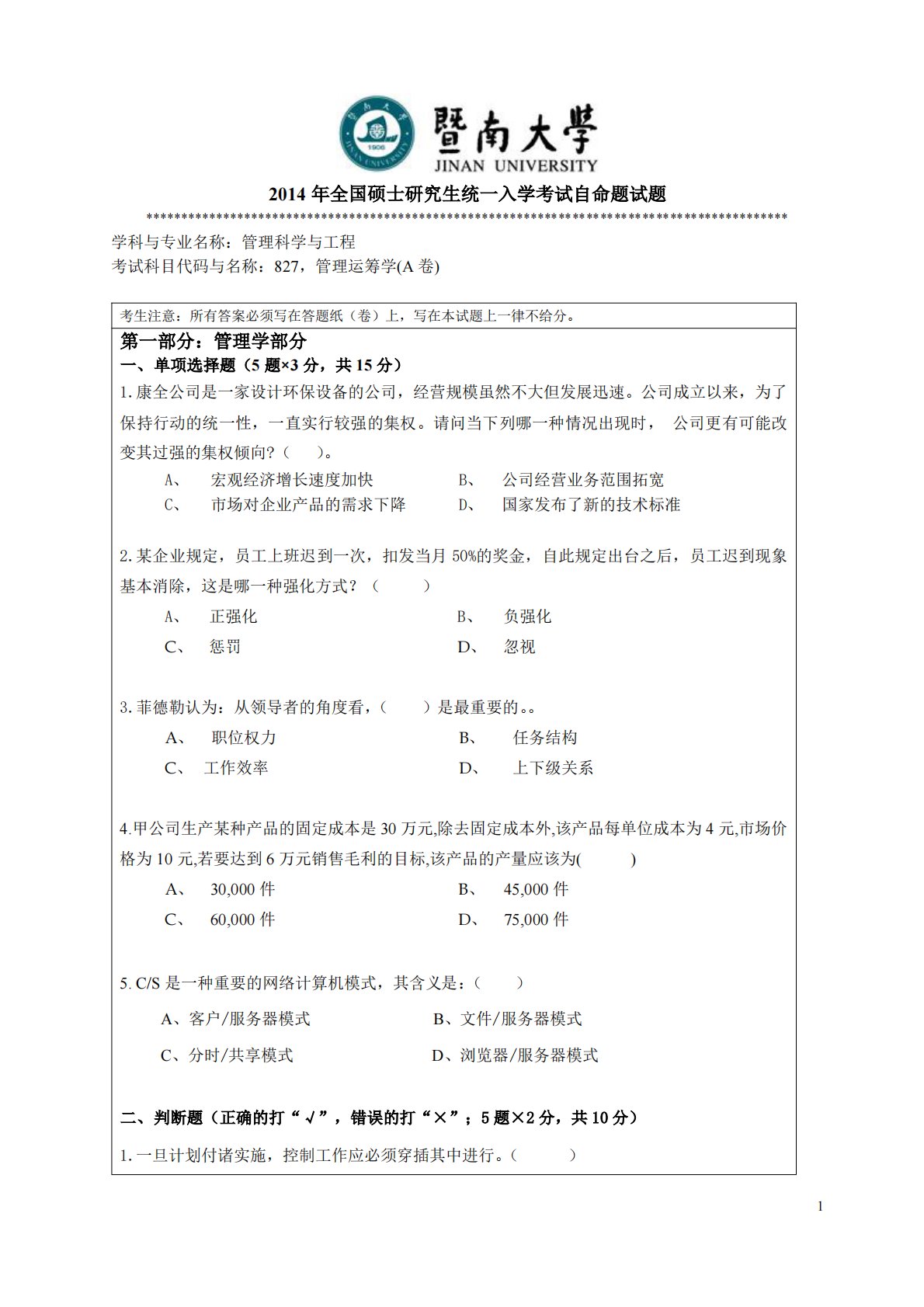 12014年全国硕士研究生统一入学考试自命题试题********************************************************************************************学科与专业名称:管理科学与工程考试科目代码与名称:827,管理运筹学(A卷)考生注意:所有答案必须写在答题纸(卷)上,写在本试题上一律不给分。第一部分:管理学部分一、单项选择题(5题×3分,共15分)1.康全公司是一家设计环保设备的公司,经营规模虽然不大但发展迅速。公司成立以来,为了保持行动的统一性,一直实行较强的集权。请问当下列哪一种情况出现时,公司更有可能改变其...