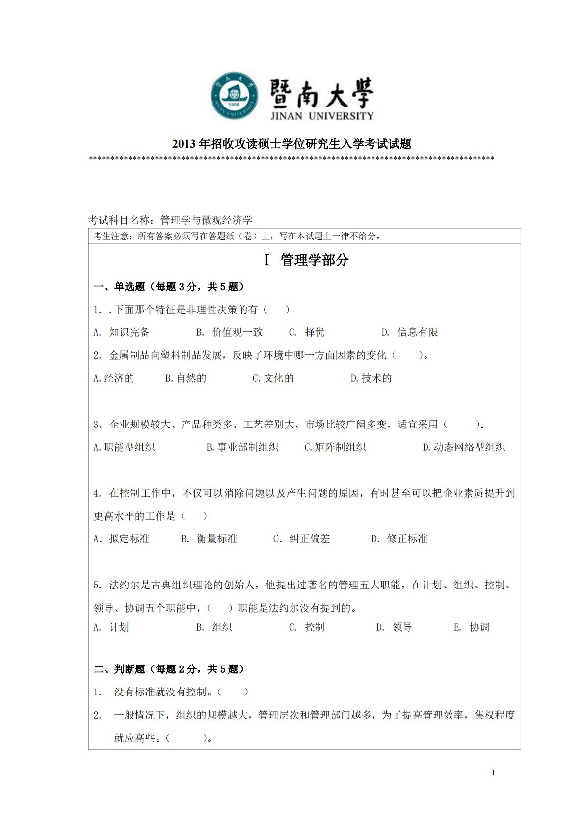 12013年招收攻读硕士学位研究生入学考试试题********************************************************************************************考试科目名称:管理学与微观经济学考生注意:所有答案必须写在答题纸(卷)上,写在本试题上一律不给分。Ⅰ管理学部分一、单选题(每题3分,共5题)1..下面那个特征是非理性决策的有()A.知识完备B.价值观一致C.择优D.信息有限2.金属制品向塑料制品发展,反映了环境中哪一方面因素的变化()。A.经济的B.自然的C.文化的D.技术的3.企业规模较大、产品种类多、工艺差别大、...