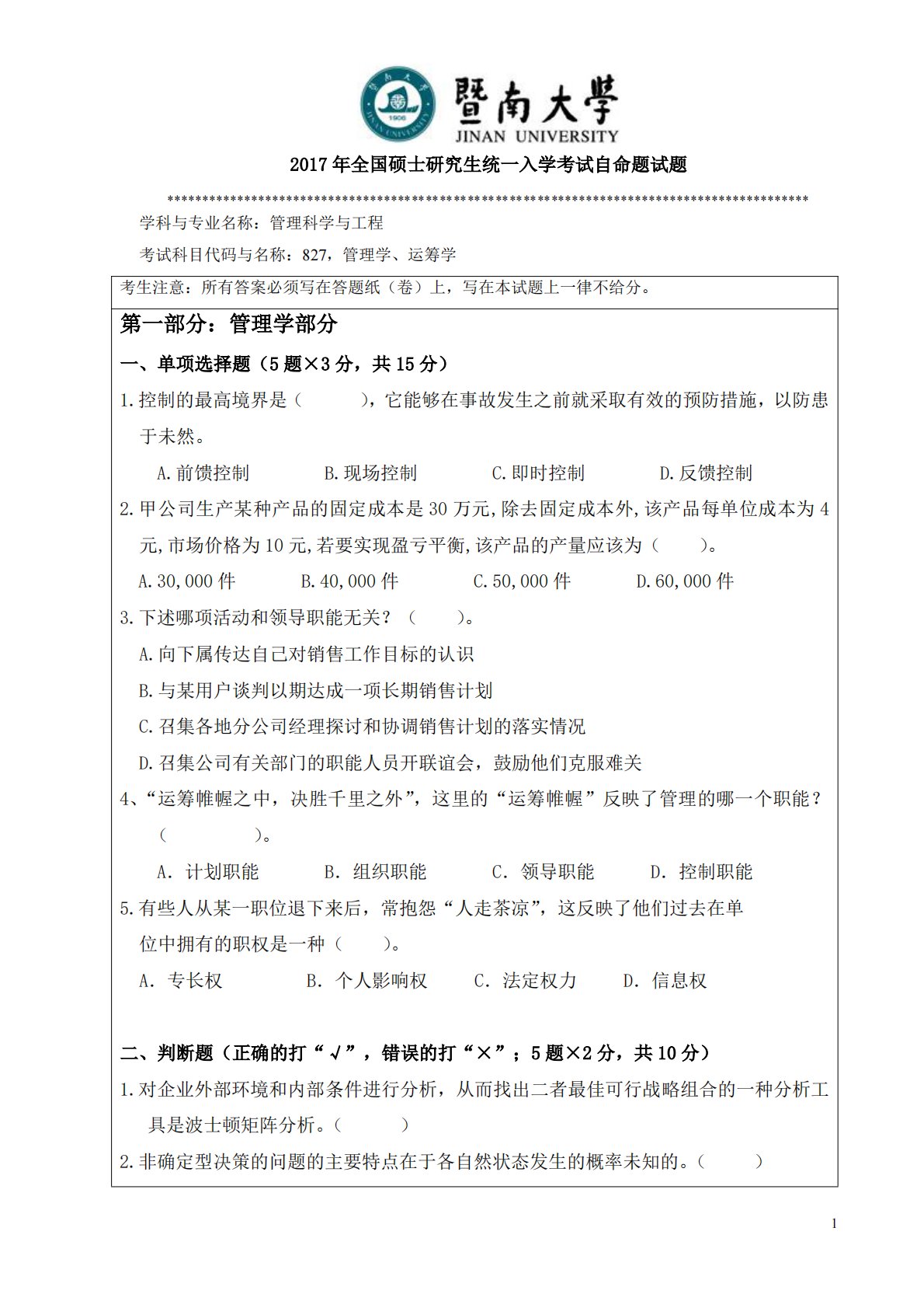 12017年全国硕士研究生统一入学考试自命题试题********************************************************************************************学科与专业名称:管理科学与工程考试科目代码与名称:827,管理学、运筹学考生注意:所有答案必须写在答题纸(卷)上,写在本试题上一律不给分。第一部分:管理学部分一、单项选择题(5题×3分,共15分)1.控制的最高境界是(),它能够在事故发生之前就采取有效的预防措施,以防患于未然。A.前馈控制B.现场控制C.即时控制D.反馈控制2.甲公司生产某种产品的固定成本是30万元...