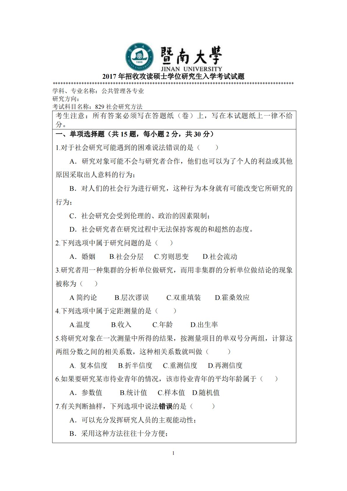 暨南大学829社会研究方法2017年真题