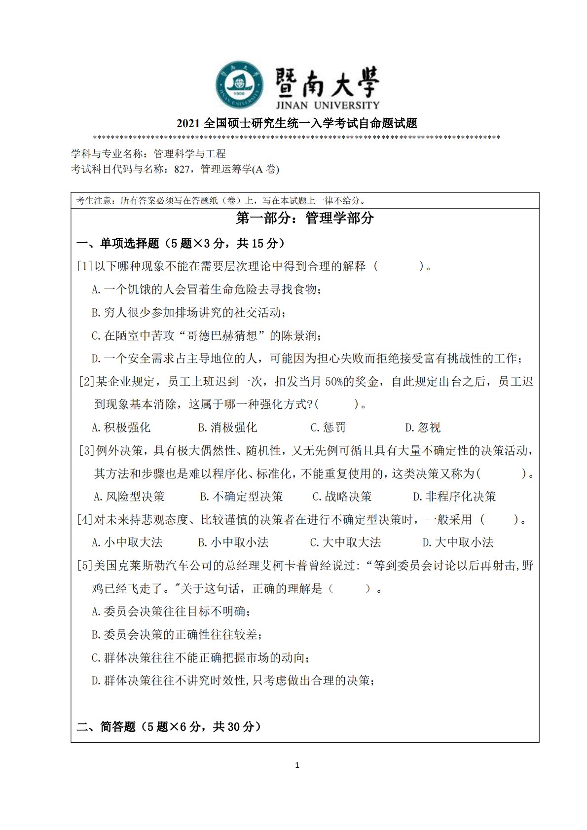 12021全国硕士研究生统一入学考试自命题试题********************************************************************************************学科与专业名称:管理科学与工程考试科目代码与名称:827,管理运筹学(A卷)考生注意:所有答案必须写在答题纸(卷)上,写在本试题上一律不给分。第一部分:管理学部分一、单项选择题(5题×3分,共15分)[1]以下哪种现象不能在需要层次理论中得到合理的解释()。A.一个饥饿的人会冒着生命危险去寻找食物;B.穷人很少参加排场讲究的社交活动;C.在陋室中苦攻“哥德巴赫猜想”的...