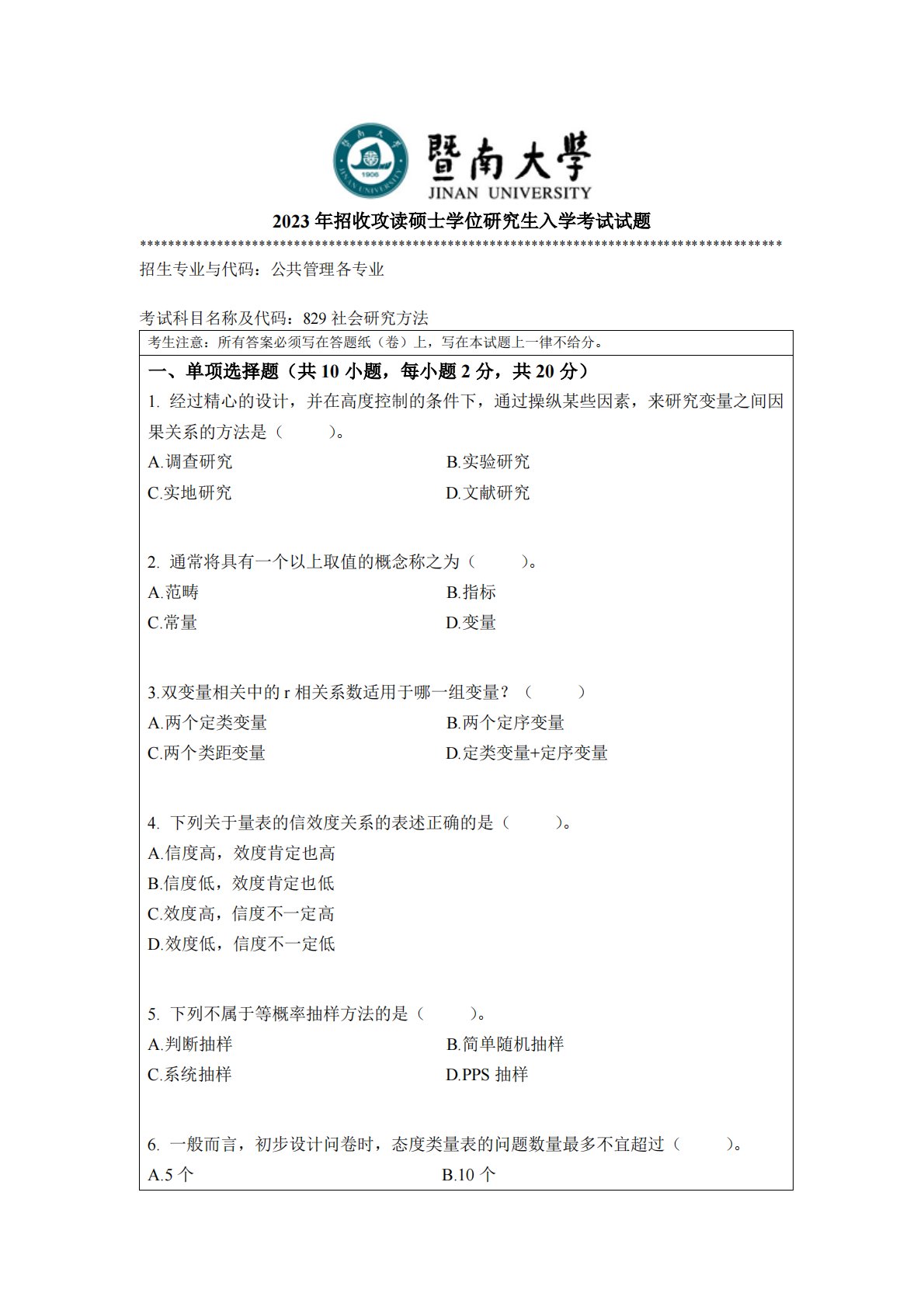 暨南大学829社会研究方法2023年真题