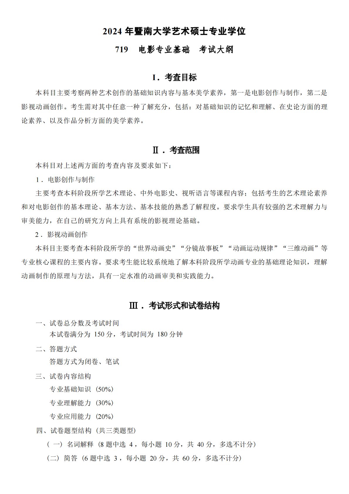 2024719I本科目主要考察两种艺术创作的基础知识内容与基本美学素养,第一是电影创作与制作,第二是影视动画创作。考生需对其中任意一种了解充分,包括:对基础知识的记忆和理解、在史论方面的理论素养、以及作品分析方面的美学素养。本科目对上述两方面的考查内容及要求如下:1.电影创作与制作主要考查本科阶段所学艺术理论、中外电影史、视听语言等课程内容;包括考生的艺术理论素养和对电影创作的基本理论、基本方法、基本技能的熟悉了解程度。要求学生具有较强的艺术理解力与审美能力,在自己的研究方向上具有系统的影视理论基础。2.影视动画创作本科目主要考查本科阶段所学的“世界动画史”“分镜故事板”“动画运动规律”“三维...