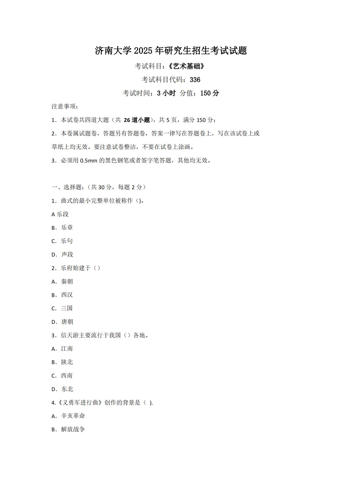 济南大学2025年研究生招生考试试题考试科目:《艺术基础》考试科目代码:336考试时间:3小时分值:150分注意事项:1.本试卷共四道大题(共26道小题),共5页,满分150分;2.本卷属试题卷,答题另有答题卷,答案一律写在答题卷上,写在该试卷上或草纸上均无效。要注意试卷整洁,不要在试卷上涂画。3.必须用0.5mm的黑色钢笔或者签字笔答题,其他均无效。一、选择题:(共30分,每题2分)1.曲式的最小完整单位被称作()。A乐段B.乐章C.乐句D.声段2.乐府始建于()A.秦朝B.西汉C.三国D.唐朝3.信天游主要流行于我国()各地。A.江南B.陕北C.西南D.东北4.《义勇军进行曲》创作的背景是...