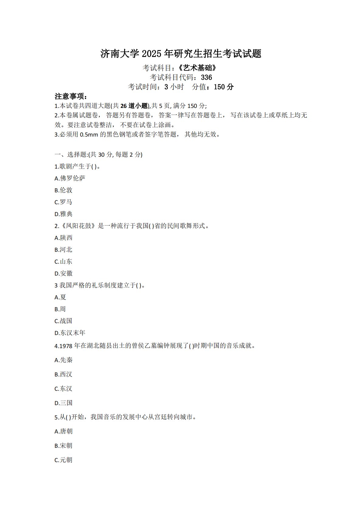 济南大学2025年研究生招生考试试题考试科目:《艺术基础》考试科目代码:336考试时间:3小时分值:150分注意事项:1.本试卷共四道大题(共26道小题),共5页,满分150分;2.本卷属试题卷,答题另有答题卷,答案一律写在答题卷上,写在该试卷上或草纸上均无效。要注意试卷整洁,不要在试卷上涂画。3.必须用0.5mm的黑色钢笔或者签字笔答题,其他均无效。一、选择题:(共30分,每题2分)1.歌剧产生于()。A.佛罗伦萨B.伦敦C.罗马D.雅典2.《凤阳花鼓》是一种流行于我国()省的民间歌舞形式。A.陕西B.河北C.山东D.安徽3我国严格的礼乐制度建立于()。A.夏B.周C.战国D.东汉末年4.1...