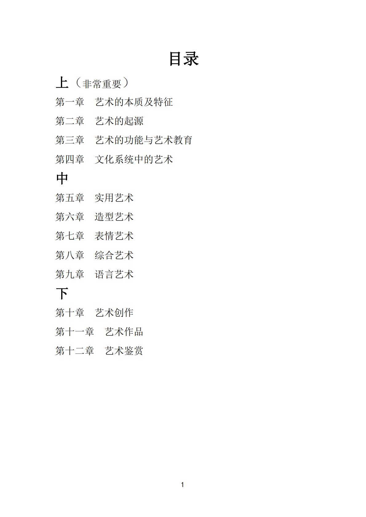 1目录上(非常重要)第一章艺术的本质及特征第二章艺术的起源第三章艺术的功能与艺术教育第四章文化系统中的艺术中第五章实用艺术第六章造型艺术第七章表情艺术第八章综合艺术第九章语言艺术下第十章艺术创作第十一章艺术作品第十二章艺术鉴赏2第一章艺术的本质及特征第一节、1.客观精神说艺术的本质一、关于艺术本质的几种主要看法(简答题)1.客观精神说(名词解释)观点:艺术是“理念”或者客观“宇宙精神”的体现。代表人物:①柏拉图:理性世界是第一性的,是真实的;感性世界是第二性的,艺术世界仅仅是第三性的。②黑格尔:美就是理念的感性显现,理念是内容,“感性显现”是表现形式。二者是统一的,艺术离不开内容,也离不开形式...