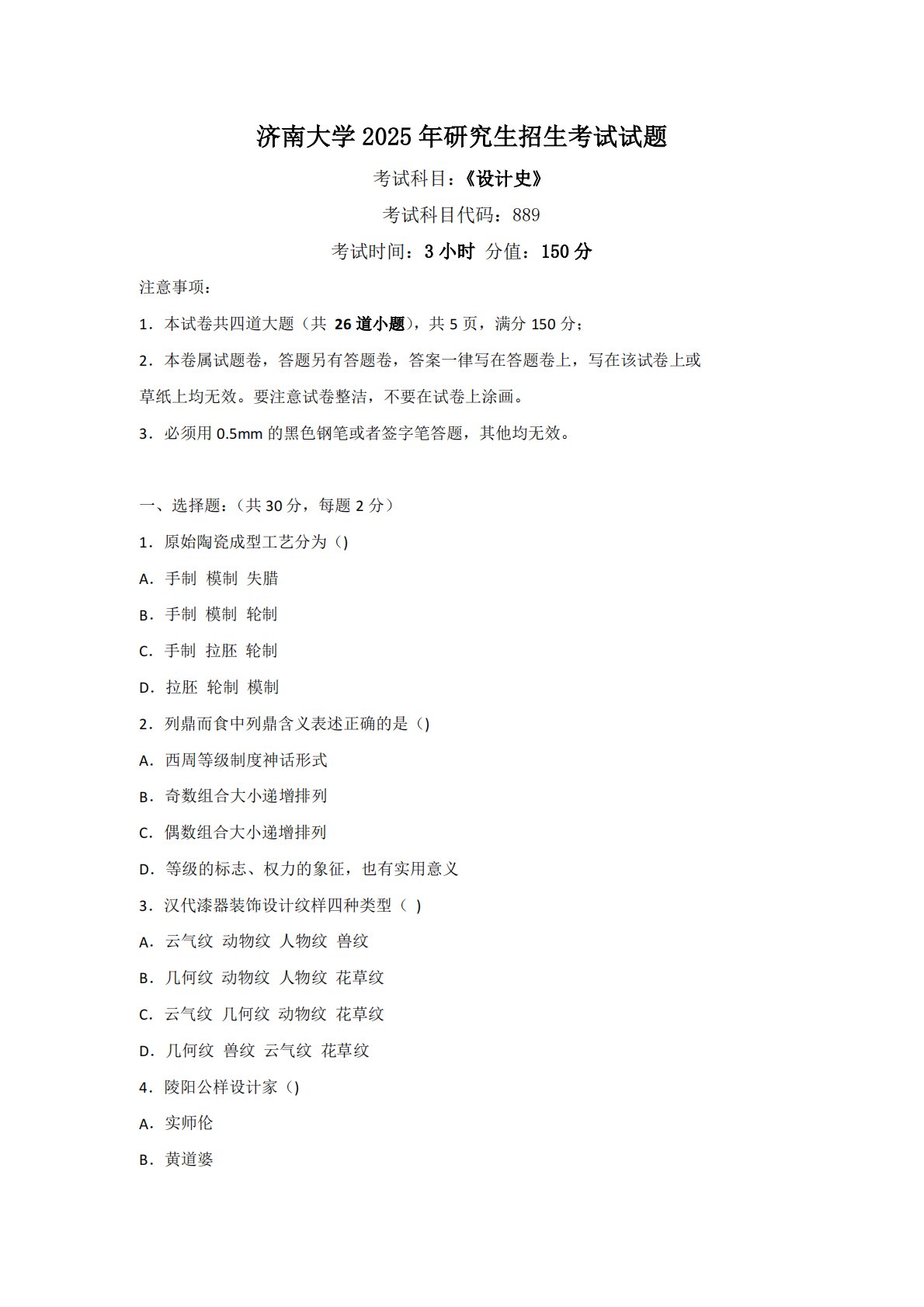 济南大学2025年研究生招生考试试题考试科目:《设计史》考试科目代码:889考试时间:3小时分值:150分注意事项:1.本试卷共四道大题(共26道小题),共5页,满分150分;2.本卷属试题卷,答题另有答题卷,答案一律写在答题卷上,写在该试卷上或草纸上均无效。要注意试卷整洁,不要在试卷上涂画。3.必须用0.5mm的黑色钢笔或者签字笔答题,其他均无效。一、选择题:(共30分,每题2分)1.原始陶瓷成型工艺分为()A.手制模制失腊B.手制模制轮制C.手制拉胚轮制D.拉胚轮制模制2.列鼎而食中列鼎含义表述正确的是()A.西周等级制度神话形式B.奇数组合大小递增排列C.偶数组合大小递增排列D.等级的标...