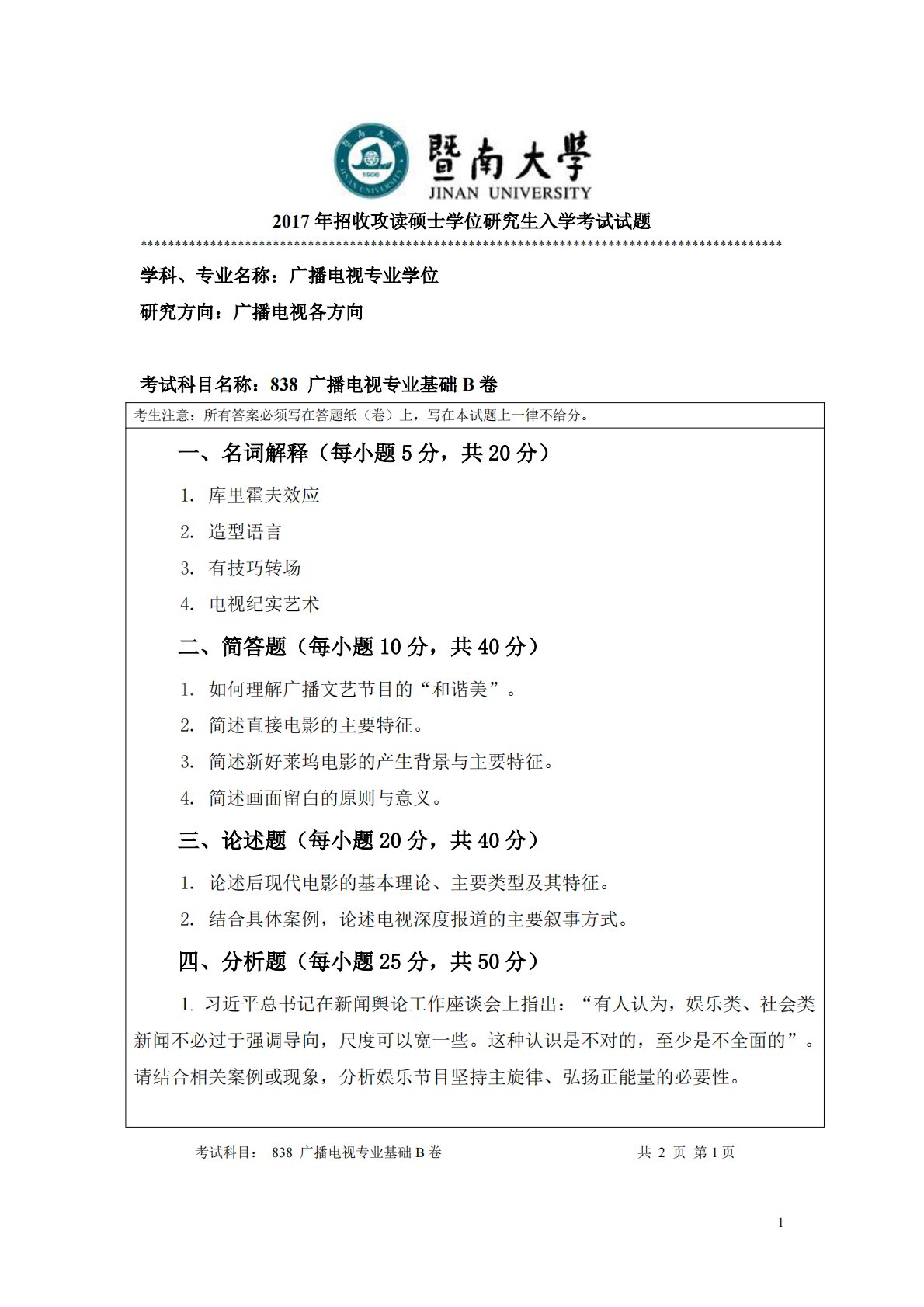 12017年招收攻读硕士学位研究生入学考试试题********************************************************************************************学科、专业名称:广播电视专业学位研究方向:广播电视各方向考试科目名称:838广播电视专业基础B卷考生注意:所有答案必须写在答题纸(卷)上,写在本试题上一律不给分。一、名词解释(每小题5分,共20分)1.库里霍夫效应2.造型语言3.有技巧转场4.电视纪实艺术二、简答题(每小题10分,共40分)1.如何理解广播文艺节目的“和谐美”。2.简述直接电影的主要特征。3.简述新好...