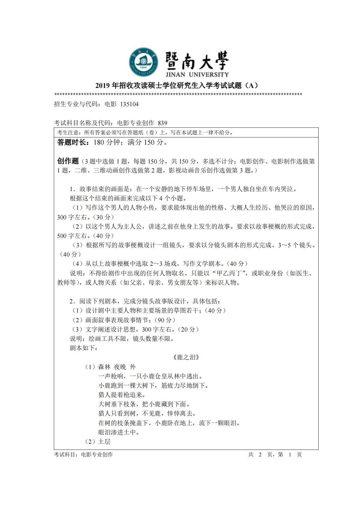 暨南大学839电影专业创作2019年真题