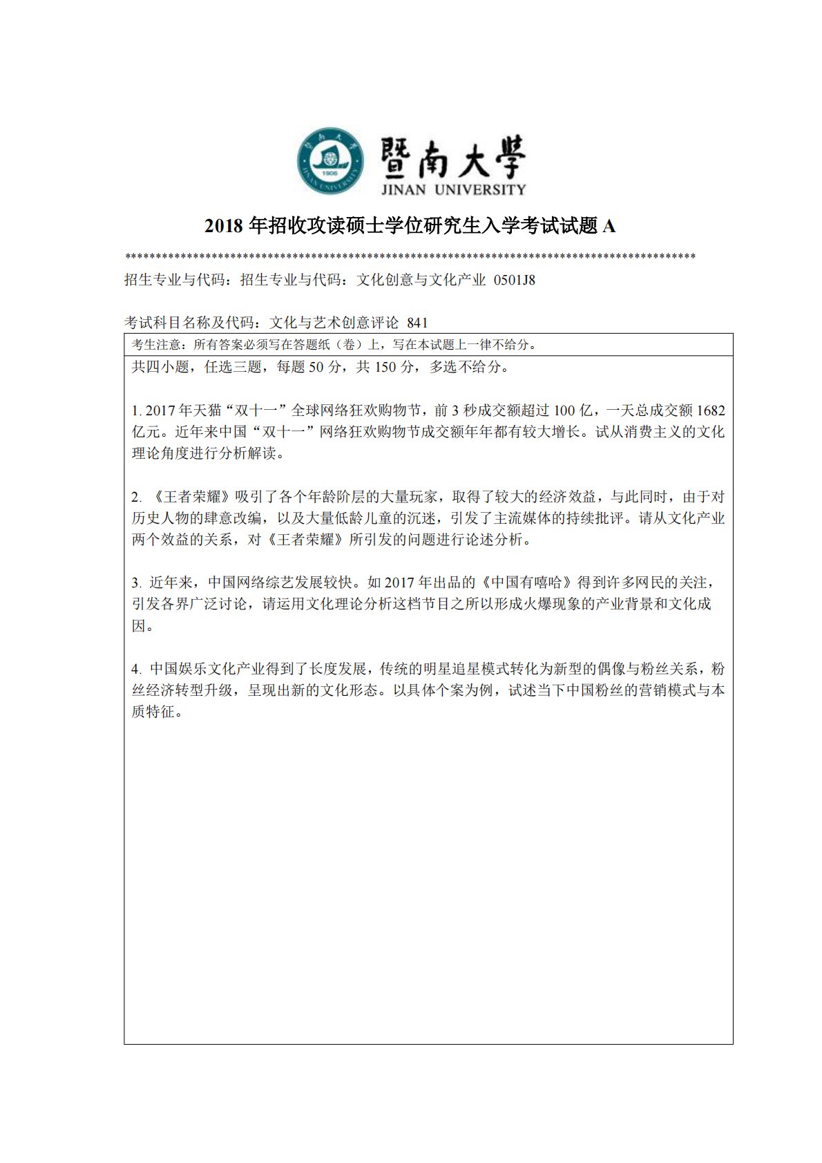 暨南大学841文化与艺术创意评论2018年真题
