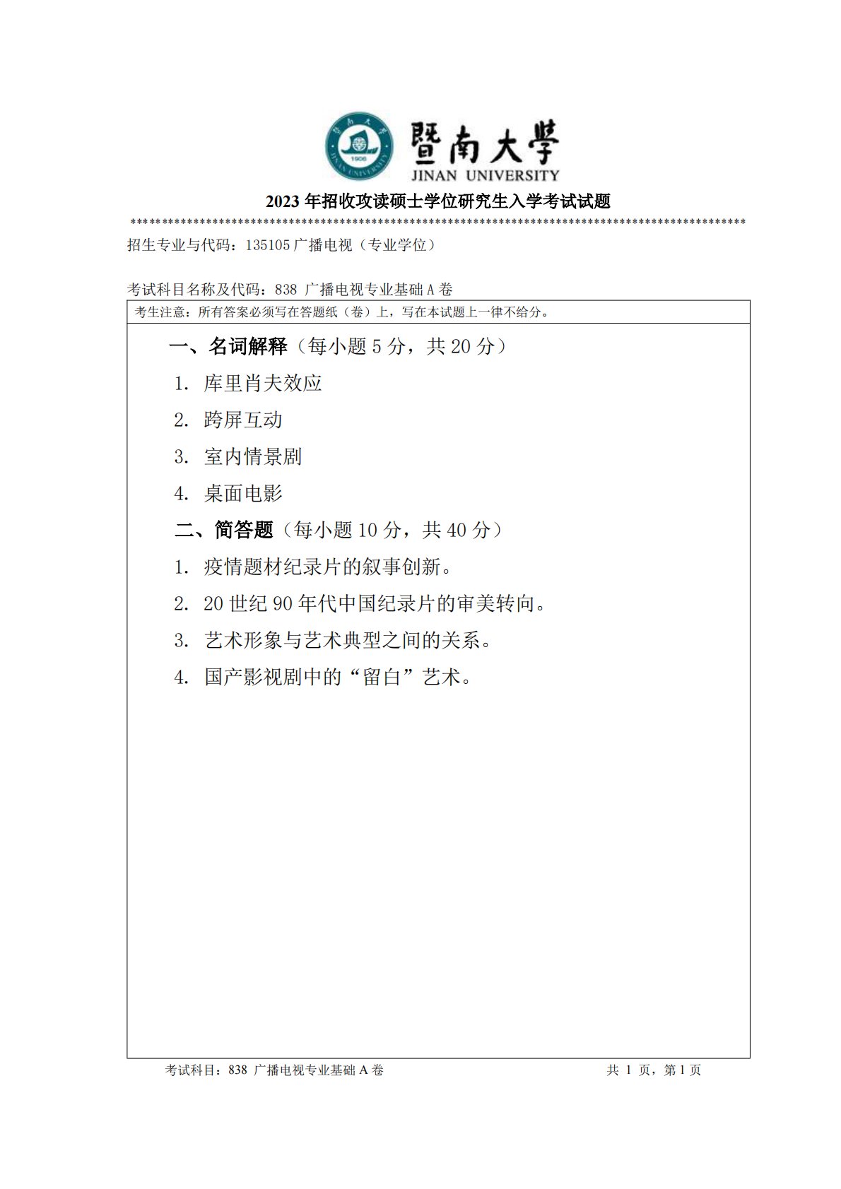 2023年招收攻读硕士学位研究生入学考试试题*************************************************************************************************招生专业与代码:135105广播电视(专业学位)考试科目名称及代码:838广播电视专业基础A卷考生注意:所有答案必须写在答题纸(卷)上,写在本试题上一律不给分。一、名词解释(每小题5分,共20分)1.库里肖夫效应2.跨屏互动3.室内情景剧4.桌面电影二、简答题(每小题10分,共40分)1.疫情题材纪录片的叙事创新。2.20世纪90年代中国纪录片的审美转向。3....