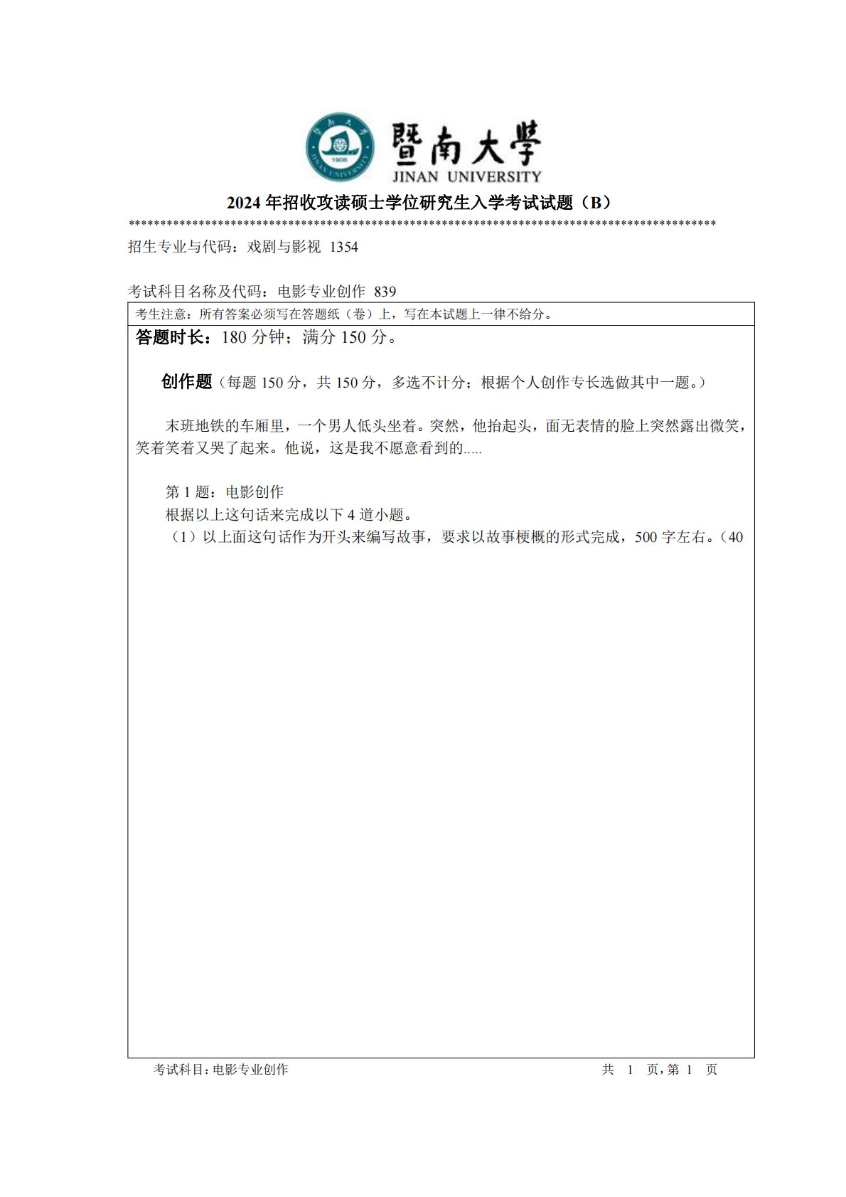 暨南大学839电影专业创作2024年真题