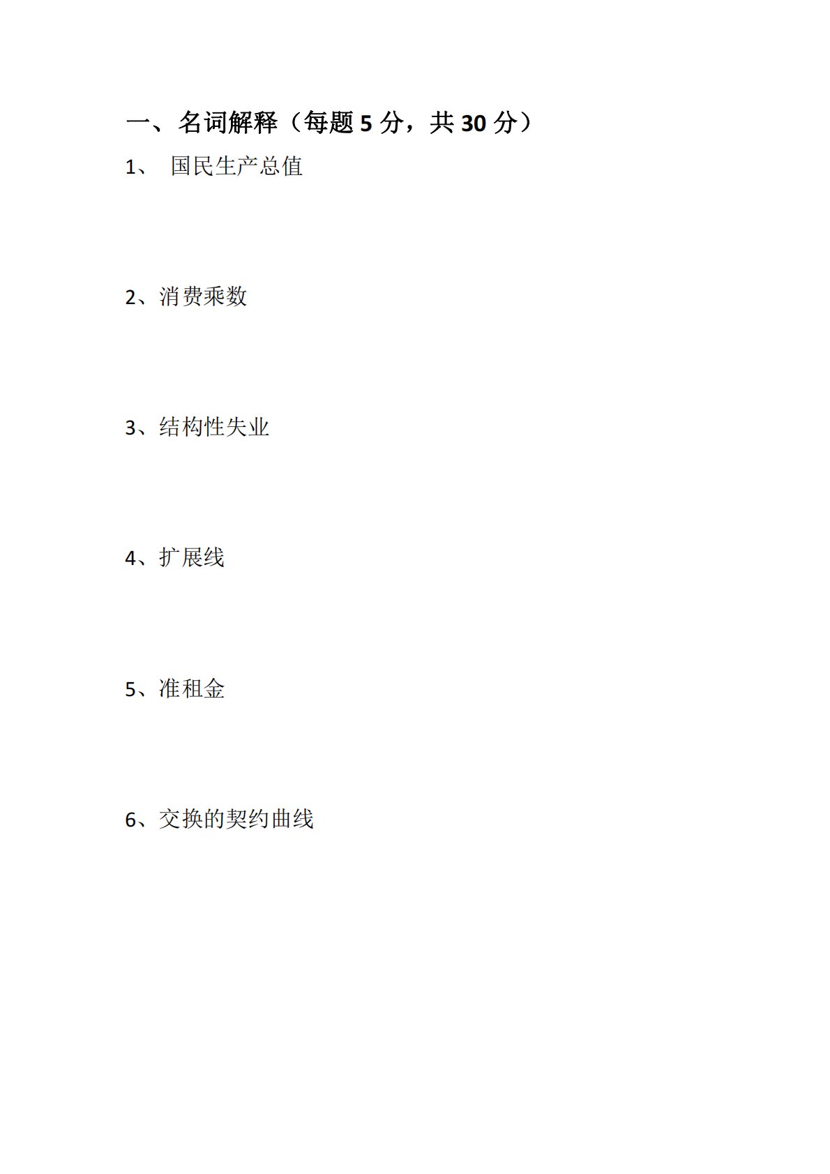 一、名词解释(每题5分,共30分)1、国民生产总值2、消费乘数3、结构性失业4、扩展线5、准租金6、交换的契约曲线二、简答题、作图题(每题8分,共40分)1、货币政策的三大工具。2、说明LM曲线平移的因素。3、给定IS曲线,用IS—LM曲线的图形说明扩张性财政政策的效力大小与LM曲线形状的关系。4、扩张性货币政策对宏观经济变量的短期影响。5、什么样的无差异曲线是行为良好的无差异曲线?它具有哪些性质?6、简述完全竞争市场长期均衡的实现过程和特点。7、简述完全竞争条件下单要素投入企业的生产要素需求曲线。三、计算题(每题10分,共20分)1、某消费者的效用函数和预算约束分别为U=X3/2Y和3X+4...