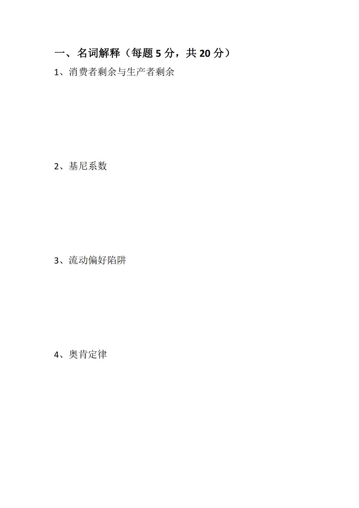 一、名词解释(每题5分,共20分)1、消费者剩余与生产者剩余2、基尼系数3、流动偏好陷阱4、奥肯定律二、简答题(每题10分,共40分)1、短期内一种可变要素条件下,生产要素的三个区域中,理性的生产经营者应该在哪个区域使用该可变要素?为什么?(请配图说明)2、单个劳动者的劳动供给曲线为什么有时会出现“回弯”(从正的斜率转为负的斜率)?3、什么是菲利普斯曲线?短期和长期的菲利普斯曲线有什么样的关系?4、货币政策的主要工具有哪些?三、作图说明题(每题10分,共40分)1、请作图说明劣等品的收入效应和替代效应。2、作图说明消费者均衡和生产者均衢。3、请利用NI-AE模型与IS-LM模型,作图比较说明两...