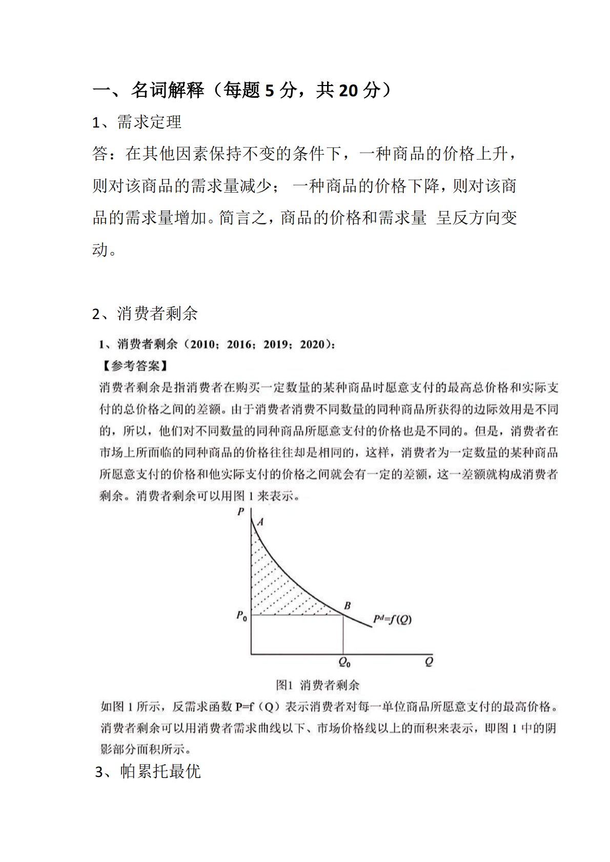 一、名词解释(每题5分,共20分)1、需求定理答:在其他因素保持不变的条件下,一种商品的价格上升,则对该商品的需求量减少;一种商品的价格下降,则对该商品的需求量增加。简言之,商品的价格和需求量呈反方向变动。2、消费者剩余3、帕累托最优4、国内生产总值答:国内生产总值(GDP)是指经济社会(即一国或一地区)在一定时期内运用生产要素所生产的全部最终产品(产品和劳务)的市场价值。它是衡量经济增长的指标,一般仅指市场活动导致的价值。它的衡量方式如下:支出法:GDP=C+I+G+(X-M)收入法:GDP=工资+利息+租金+利润+折旧+间接税-补助金二、图示说明题(任选两题,每题15分,共30分)1、图示...
