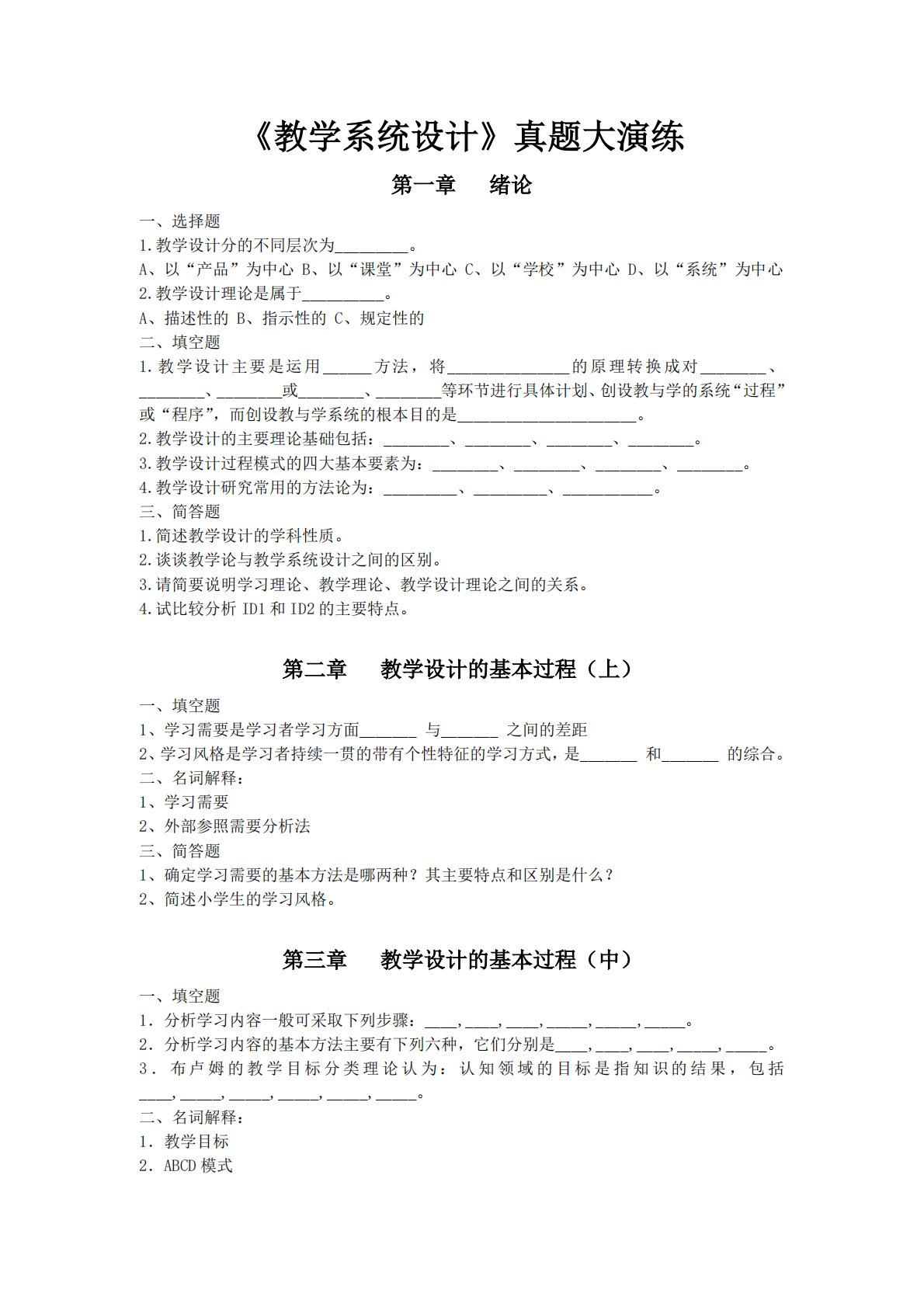 《教学系统设计》真题大演练第一章绪论一、选择题1.教学设计分的不同层次为_________。A、以“产品”为中心B、以“课堂”为中心C、以“学校”为中心D、以“系统”为中心2.教学设计理论是属于__________。A、描述性的B、指示性的C、规定性的二、填空题1.教学设计主要是运用______方法,将_______________的原理转换成对________、________、________或________、________等环节进行具体计划、创设教与学的系统“过程”或“程序”,而创设教与学系统的根本目的是______________________。2.教学设计的主要理论基础包括:_...