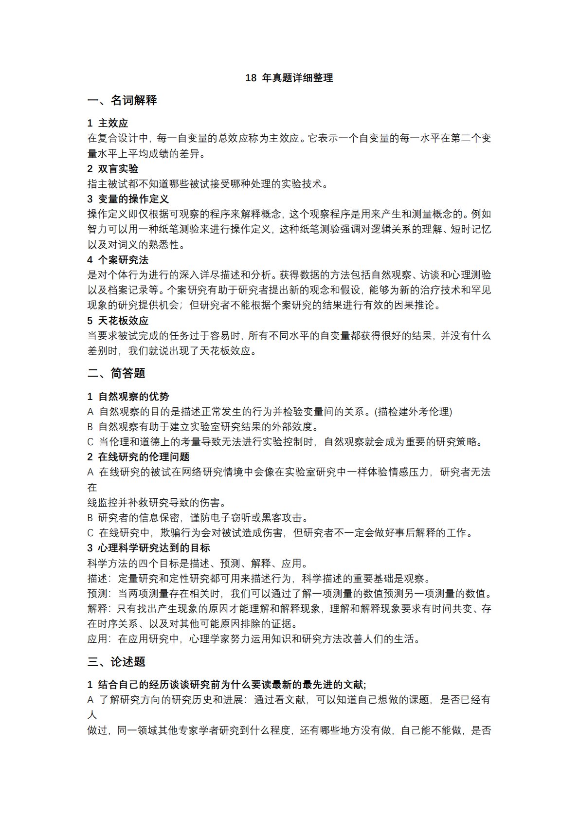 18年真题详细整理一、名词解释1主效应在复合设计中,每一自变量的总效应称为主效应。它表示一个自变量的每一水平在第二个变量水平上平均成绩的差异。2双盲实验指主被试都不知道哪些被试接受哪种处理的实验技术。3变量的操作定义操作定义即仅根据可观察的程序来解释概念,这个观察程序是用来产生和测量概念的。例如智力可以用一种纸笔测验来进行操作定义,这种纸笔测验强调对逻辑关系的理解、短时记忆以及对词义的熟悉性。4个案研究法是对个体行为进行的深入详尽描述和分析。获得数据的方法包括自然观察、访谈和心理测验以及档案记录等。个案研究有助于研究者提出新的观念和假设,能够为新的治疗技术和罕见现象的研究提供机会;但研究者不能...