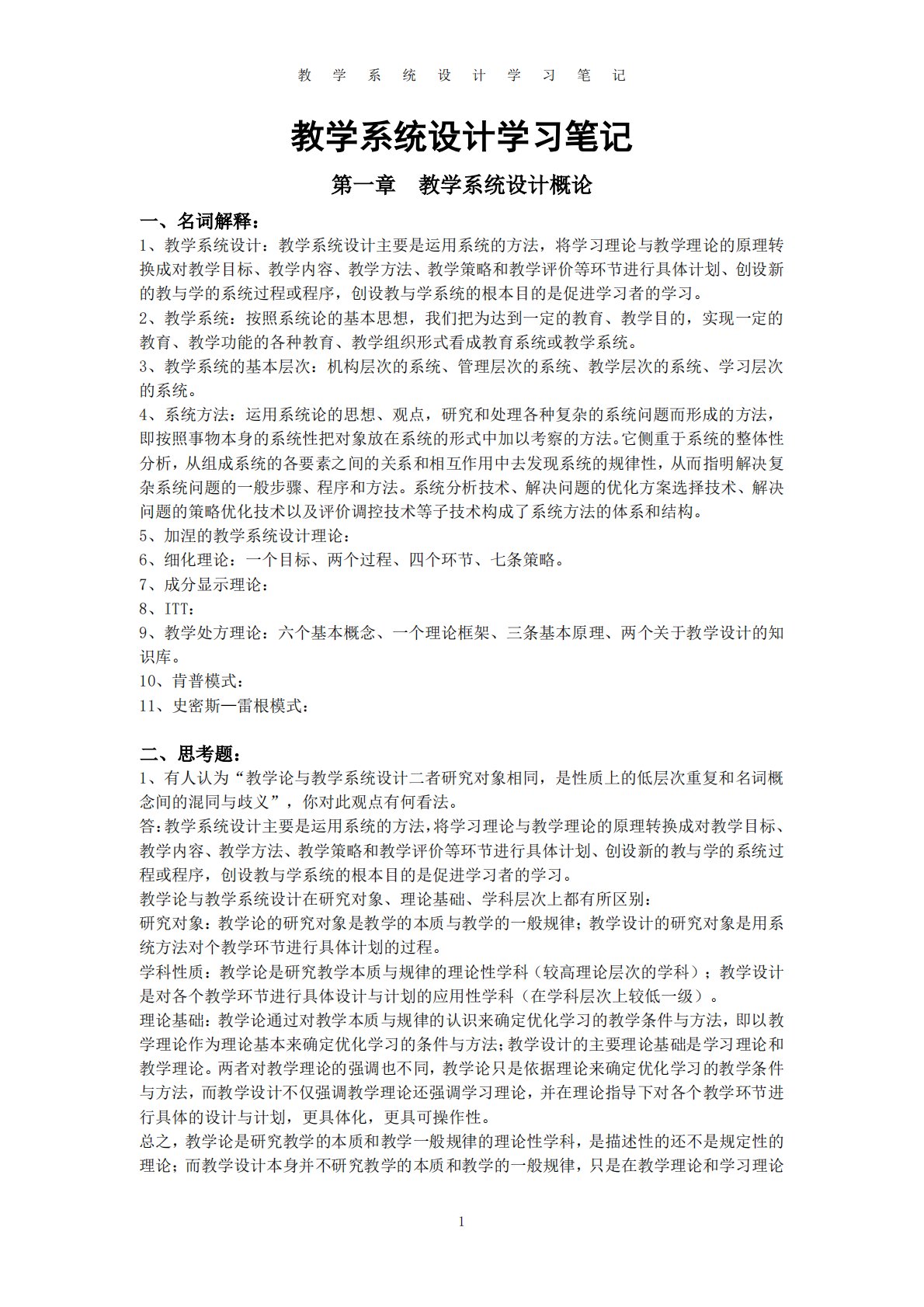 教学系统设计学习笔记1教学系统设计学习笔记第一章教学系统设计概论一、名词解释:1、教学系统设计:教学系统设计主要是运用系统的方法,将学习理论与教学理论的原理转换成对教学目标、教学内容、教学方法、教学策略和教学评价等环节进行具体计划、创设新的教与学的系统过程或程序,创设教与学系统的根本目的是促进学习者的学习。2、教学系统:按照系统论的基本思想,我们把为达到一定的教育、教学目的,实现一定的教育、教学功能的各种教育、教学组织形式看成教育系统或教学系统。3、教学系统的基本层次:机构层次的系统、管理层次的系统、教学层次的系统、学习层次的系统。4、系统方法:运用系统论的思想、观点,研究和处理各种复杂的系统...